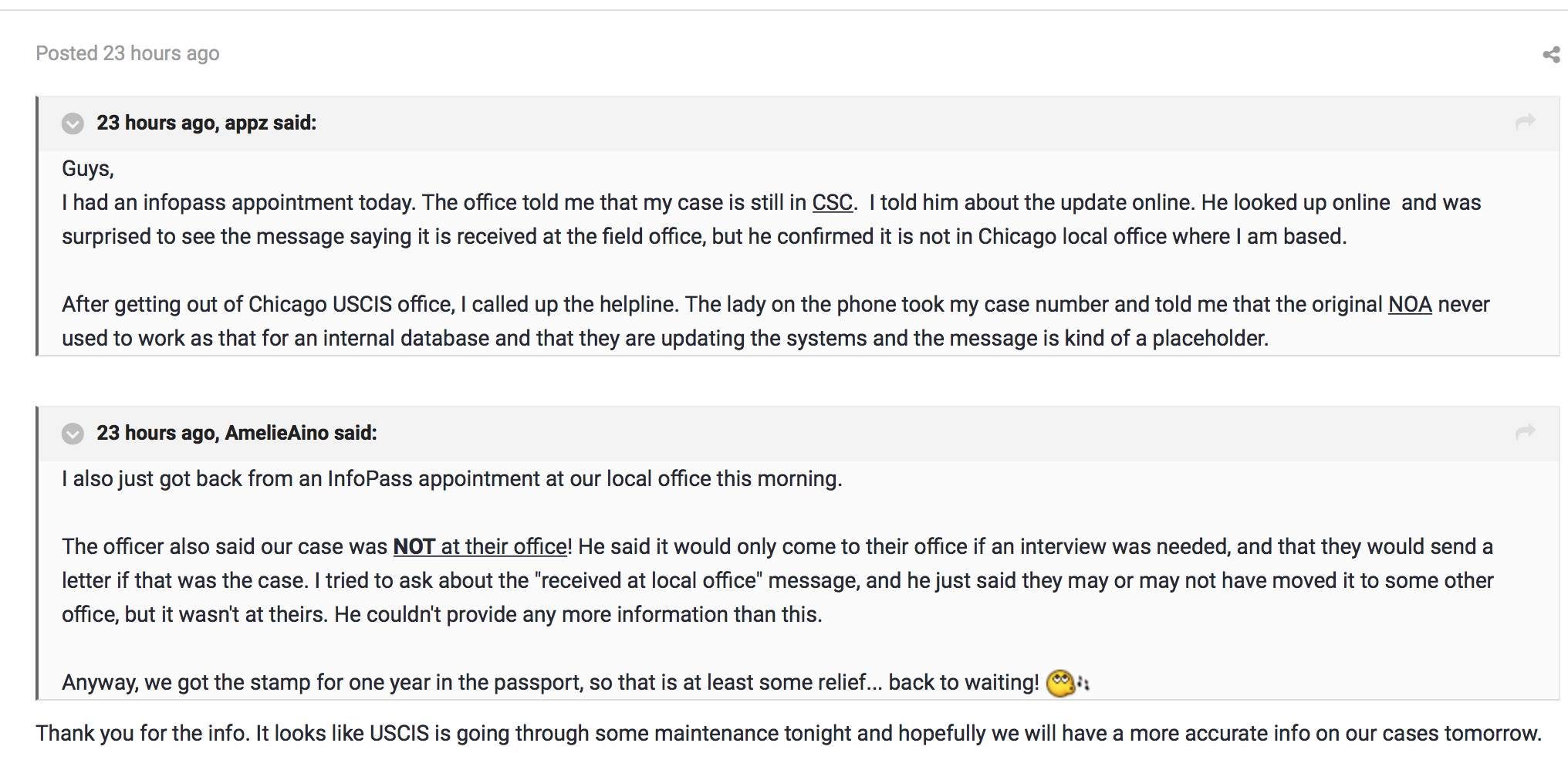 Ucraniana писал(а): Девочки, кто долго ждет из Калифорнии на визаджорней народ начал проверять свой второй WAC номер (который раньше не работал) и у многих пишет что кейс получен в местном офисе. "On February 25, 2018, we received your Form I-751, Petition to Remove Conditions on Residence, Receipt Number WAC, at your local office." Вот что у меня пишет, хотя странно ведь 25 это воскресенье, я не знала что они работают. Надеюсь это не глюк в системе  я вот по этому же поводу зашла сюда отметиться. У меня тоже сообщение, только получили они кейс 26 февраля. Ноашка у меня от 22 сентября 2017!!! Теперь самое интересное. Я думала это какой то глюк в системе поскольку юскис обьявил, что они будут проводить сервисные работы на сайте 1 марта с 9 пм до полуночи по восточному времени. Но я проверила свой статус сегодня, и он все тот же: локальный офис получил мой кейс... девушка на визаджорней сказала что получила подобное изменение статуса в пятницу, а уже во вторник статус изменился на "карта была выпущена". Посмотрим, получит ли она карту в почтовый ящик, тогда можно будет делать какие-то выводы  UPD: next steps: We will prepare your case for officer review. If we need more information, we will notify you и что интересно, отметки о смене моего адреса стоят только в кейсе I-751, кейс CRI-89, тот что мы по идее должны проверять для обновлений по кейсу, как застыл с момента получения формы I-751 и никаких изменений по нему.