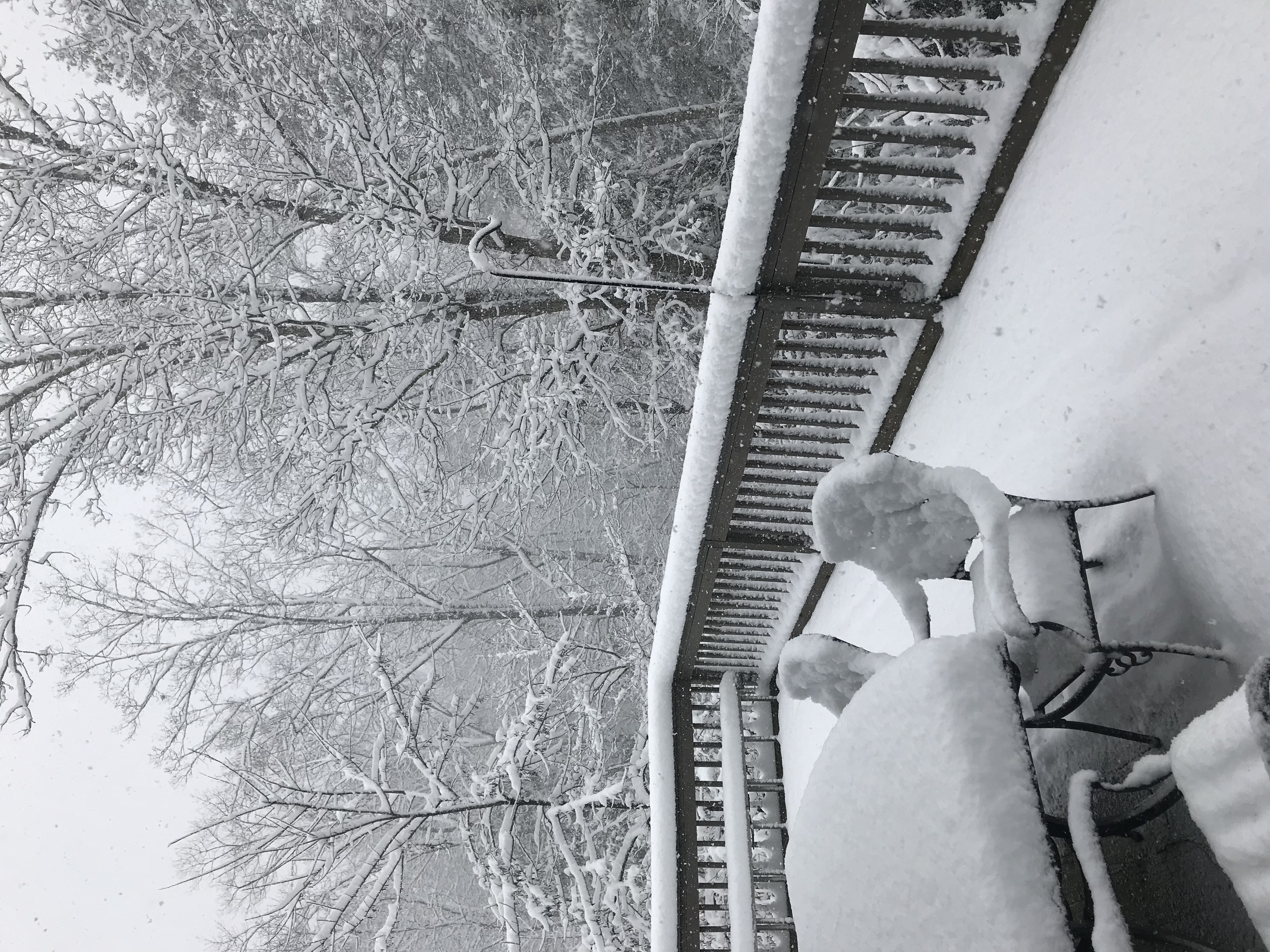 У нас с прошлой пятницы не растаял, и теперь сверху на дэке смотрю уже хороших таких пол метра и валит и валит. Из дома работала, завтра на стрижку хоть бы не отменили и расчистили к обеду. Обещают до утра идти будет. Но как в сказке все деревья.