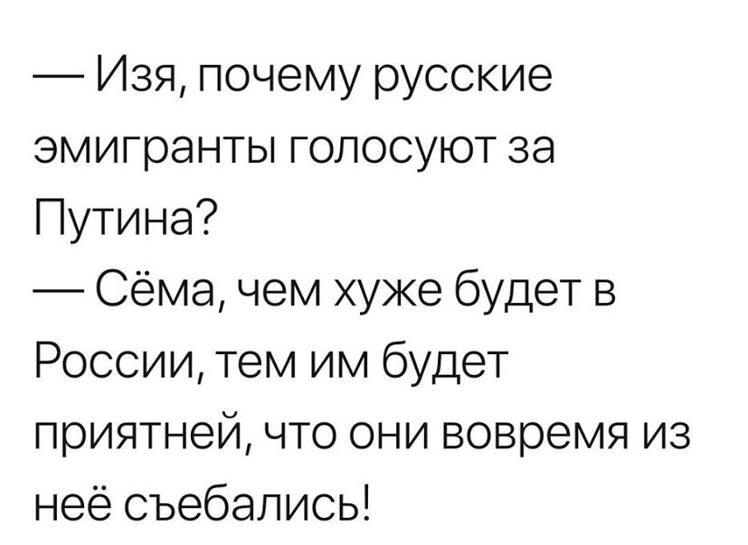 Нильская писал(а): Insomnia писал(а): Интересно чисто в познавательных целях, что они через 6 лет придумают? Лукашенко - послом в Зимбабве и новое государство, какую-нить другую новую форму правления...? Или уже вообще заморачиваться не будут, чтобы хоть какой-то вид выборов устраивать, сразу - царь? Это надо теперь американцам заботиться. Как бы в приемники Путина подсубботить своего, типа Горбачёва. Может уже выращивают в окружении Путина.  Не для того Путя с Лукашиком в кгб оттрубили, шоб каку- та леву контру у себя под боком прошляпить. Не пройдеть енто у них. скорее Трамп захайрит русских пиарщиков штопь на второй срок остаццо.