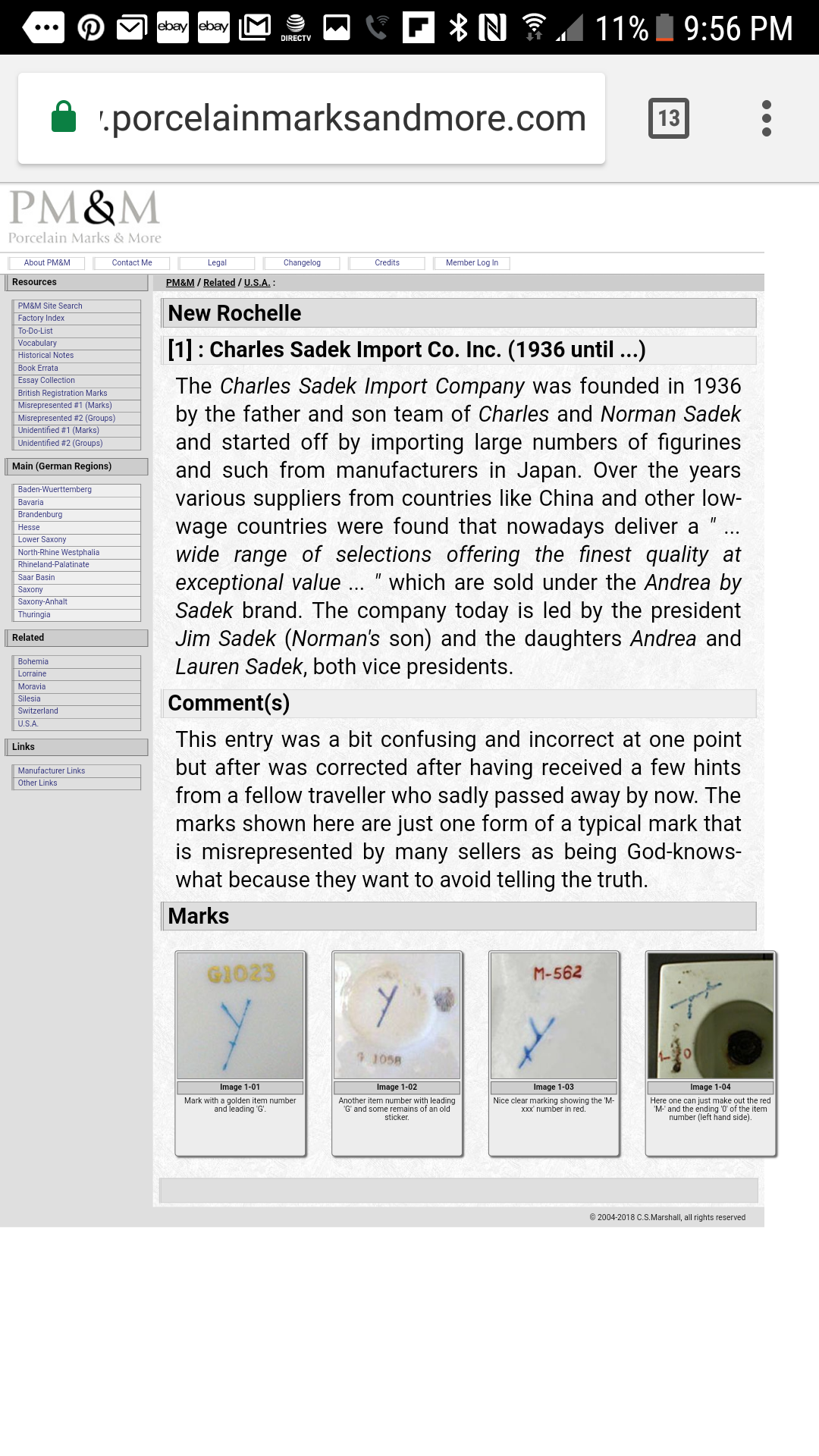 ALIEN писал(а): Так ладно, у нас очередная игрушка почесать языками.... 1. Маркинг стоит Y 2.Стиль под Мейсен 3.Нумерованное 4. Мейсеновская позолота ярче, эта толстовата и коричневата 5.Кое какой возраст присутствует, но, думаю не глубокий антик 6. К Мейссену фетр не лепили Мои предположения японский Charles Sadek 1920. У кого какие соображения Вложение: thumbnail (1).jpg Вложение: thumbnail (2).jpg Вложение: thumbnail (3).jpg Вложение: thumbnail (4).jpg Это даже не имеет значения кто это делал - не узнать никогда. Да и неважно это. Клеймо Чарльз садек. Но он был не производитель а экспортер. Как и хомко. Обе компании закупали джанк в азиатских странах и экспортировала его для бедных. Которые не могли себе дорогие вещи позволить, а хотелось повыпендриваться. ))) открылась компания в 36 году