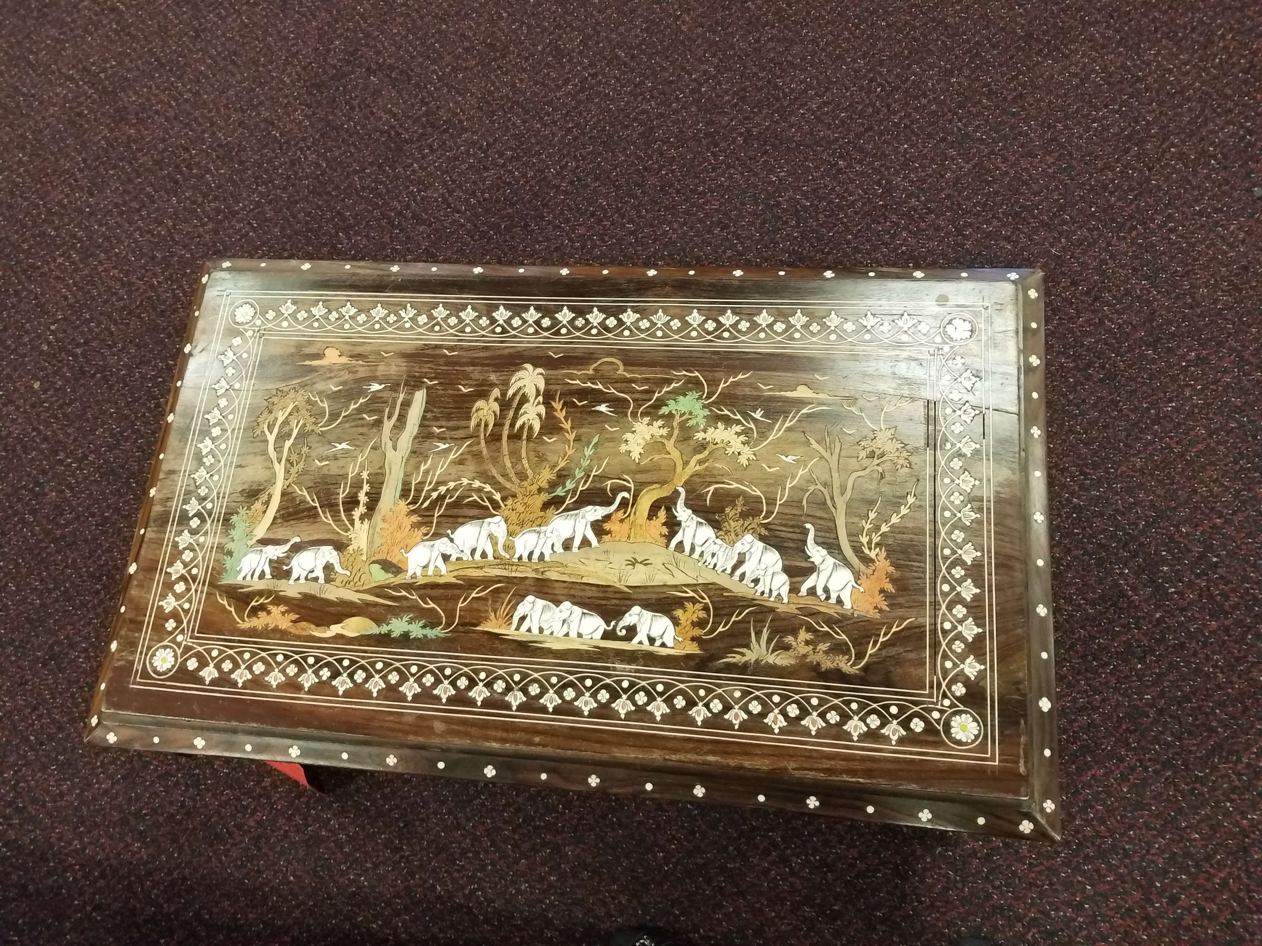 Ездила за креслом своим. Забирать. Там был столик интересный. Мне понравился но не взяла. Приткнуть мне его абсолютно некуда. Видно что ручная работа, инкрустации деревом разным и костью что ли. Может даже слоновой костью. Хотя ее запрещено продавать и покупать даже секонд хенд. И лампа была за 14 баксов симпатичная. тоже не взяла. Взяла страшненькую итальянскую холивуд редженси стиль. Потому что знаю что они дорогие плюс у меня столики итальянские в этом стиле.