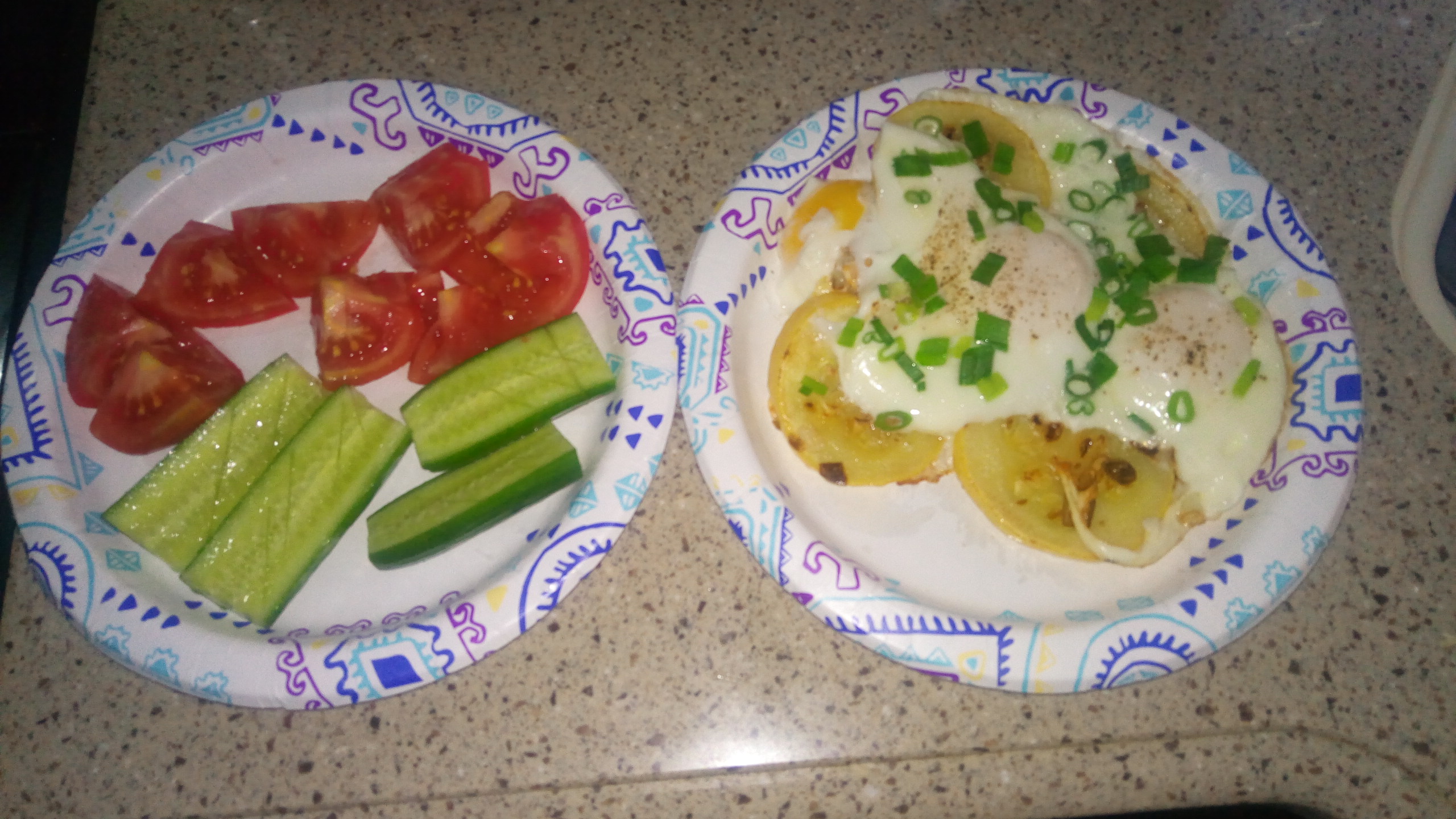 На завтрак была яичница с помидорами и зеленым луком. Йогурт, персик, абрикос, черника в течение дня.