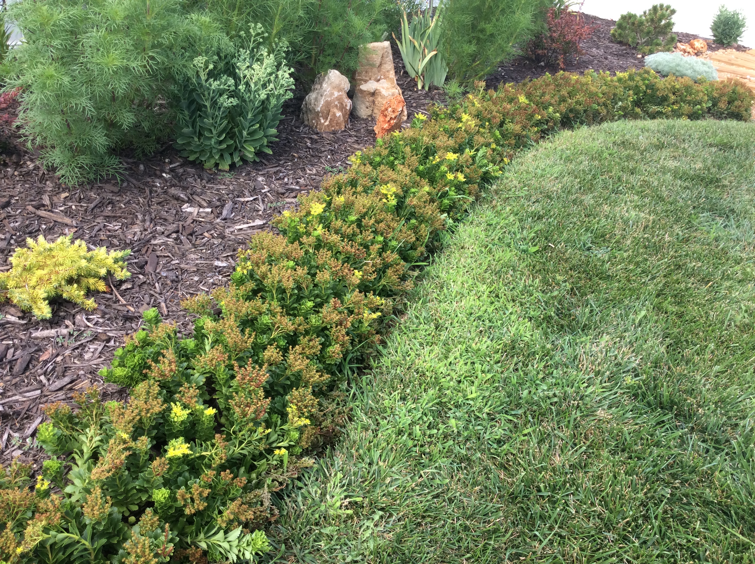 А теперь, рубрика «Вы спрашивали, мы отвечаем» Рассказываю про мой бордюр. У меня молч тоже уплывал после дождя в первый год. У нас за забором есть водяной коллектор, соответственно вся вода с молчим устремлялась туда)) Первое, что мы сделали, в самой низкой точке участка мы уложили дренажную трубу и накрыли ее камушками. Затем я сделала канавку по краю клумбы, отделив клумбу от газона. Глубина где-то 5-6 см., ширина 10-15 см. Эти расстояния не позволяют газону залезать не на свою территорию. Сама клумба немного приподнята относительно газона, где-то на 4 см. Это сделано для того, что бы вода, стекающая с крыши дома попадала точно в канавку, и по ней утекала за забор. На верхнем краю канавки, земля не плодородная, глинистая ( плодородную сразу бы водой унесло) и летом очень сухая Поэтому я подобирала специальные, очень тафф растения, которым будет окей расти в этой кондиции. Посадила я stonecop, на расстоянии 20см друг от друга Уже к началу второго года после посадки они образовали сплошную линию, которая прекрасно держит молч и + закрывает некрасивый глиняно-земляной край клумбы