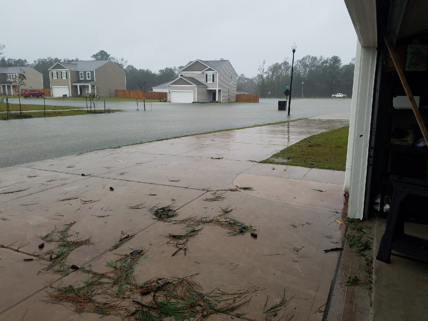 Слева от драйввея - это крик 8 футов. Дом прямо по курсу видите? В нем уже вода. В сл за ним тоже. Там ещё 3й дом есть, но его рассмотреть не удалось. Между затопленным домом и через дорогу от почтового ящика тоже был крик. Сейчас все слилось воедино. Фотографирует человек из дома с разрушенной крышей. Наш next door neighbor. 3 маленьких ребёнка. А дерево так и сидит на его крыше. Деревья видите? Сколько их? Лес. И нам они не принадлежат.