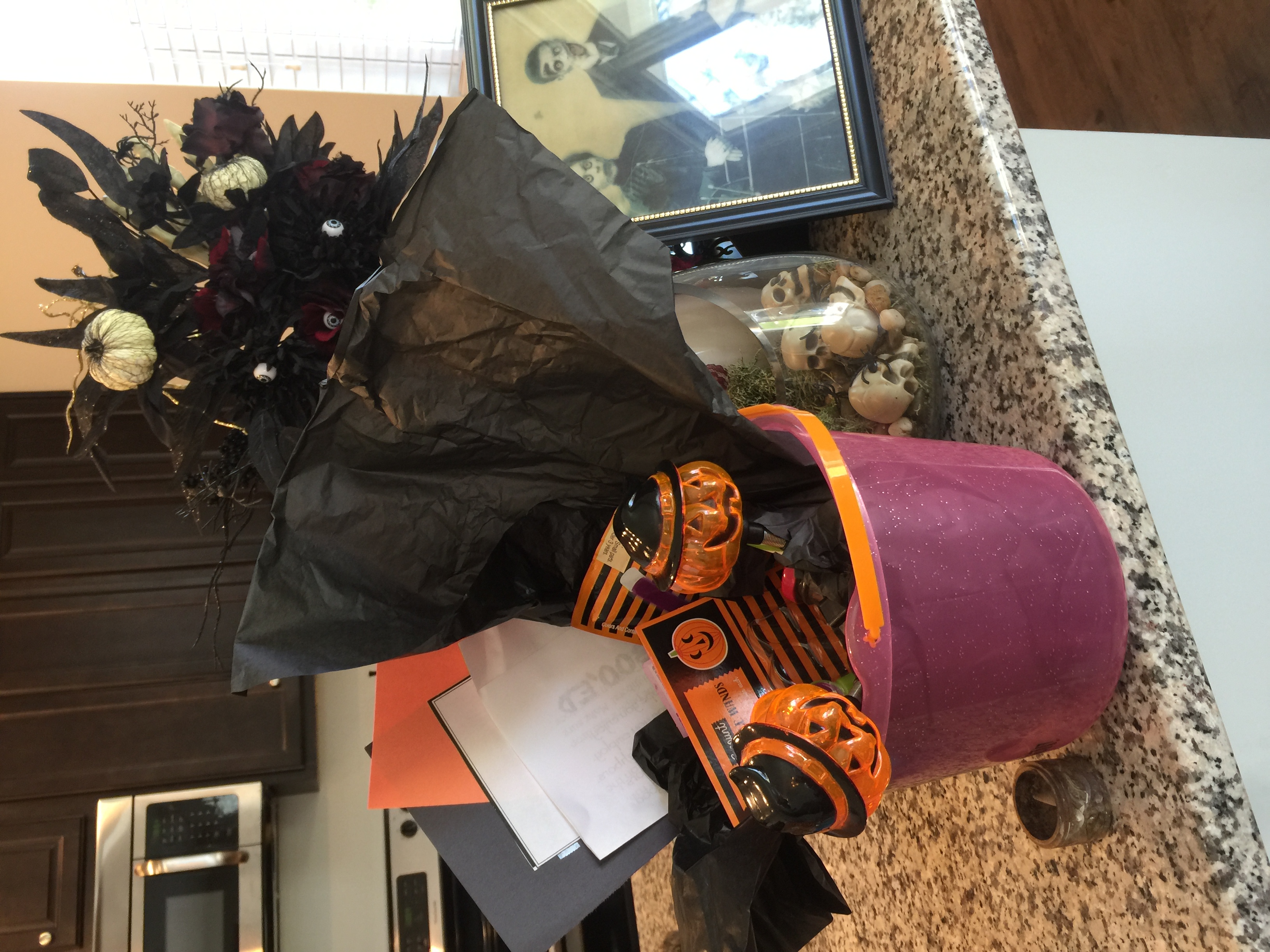 Вот мои корзинки, засунула туда любимые меняющиеся портреты, маски, черепа, скелеты, пауков. Набила перчатки конфетами, завязала, надела на перчатки светящиеся кольца. Так весело!