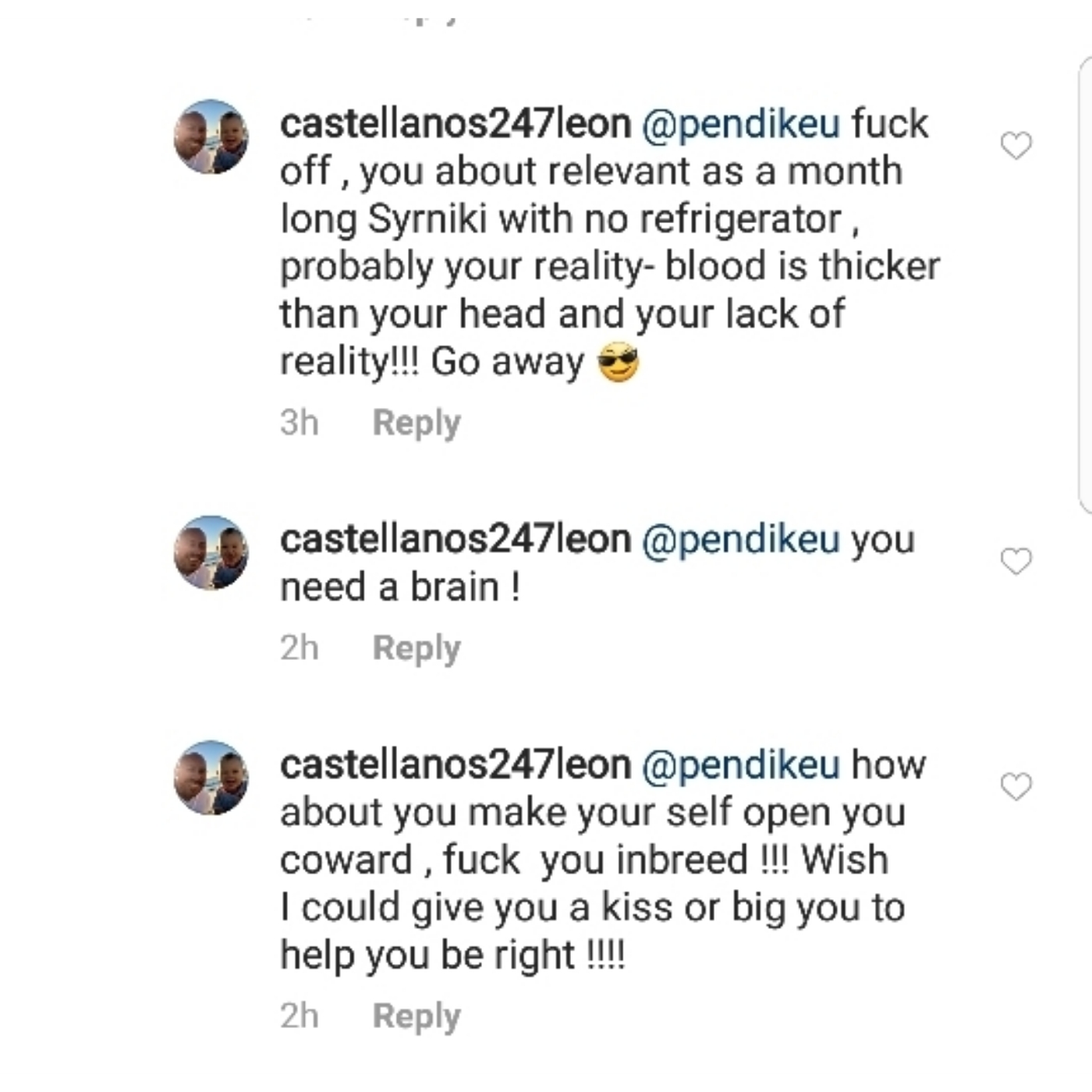 SantaMonica писал(а): Он совсем ненормальный. Не зря она про него писала, что тот еще абьюзер. Как ее так угораздило с ним попасть. Хорошо, что эти сообщения кто-то сохранил. Если вдруг её поймают, то хотя бы их на суде можно будет показать в качестве доказательства, что она опасалась за свою жизнь и жизнь ребенка рядом с ним. От нормальных мужиков женщины с младенцами не уходят.