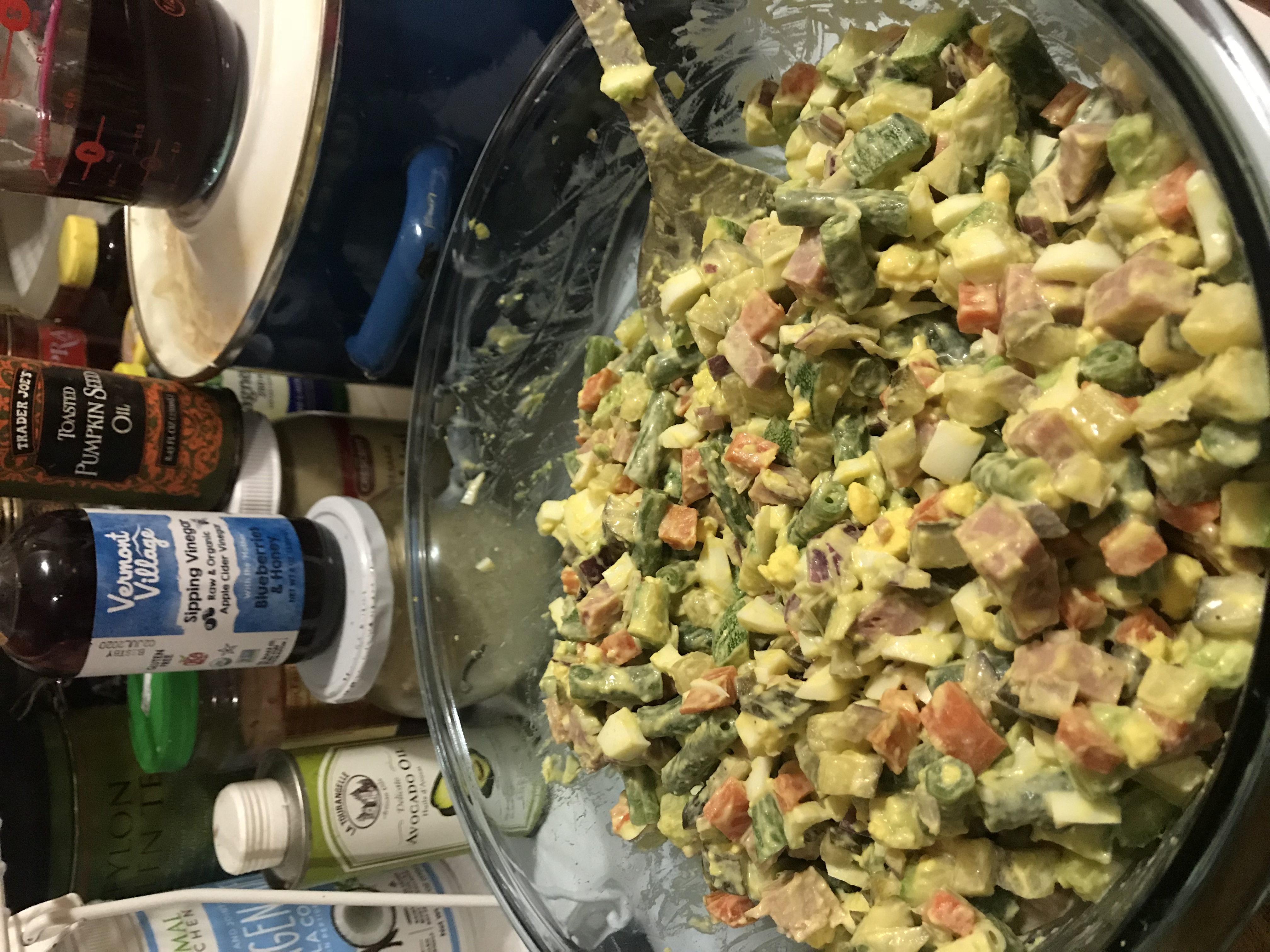 Брала uncured ham из голого фуда, кабачки на пару до полуготовности, зеленая фасоль, авокадо, яйца, красный лук,морковь, малосольные огурцы, заправка орган из трейдера джо ранч. Это бомба! да, можете еще сделать или домашний майонез классически из яиц, или, если боитесь сальмонеллы, то вместо майонеза в фуд процессоре взбить крим чиз или моцареллу+оливковое масло+авокадо+каперсы+соль+яблочный уксус+вода до консистенции. Ранч дрессинг тоже ОК. Я, когда лень самой делать заправки, использую обычный Blue Plate Mayonnaise - в нем нет углеводов и из химикатов только Calcium disodium EDTA - для того чтобы масло не прогоркало. Он связывает металлы и минералы, в том числе кальций. Не дает усваиваться. Но в малых количествах безопасно. Вы же банку майонеза за раз не сьедите.