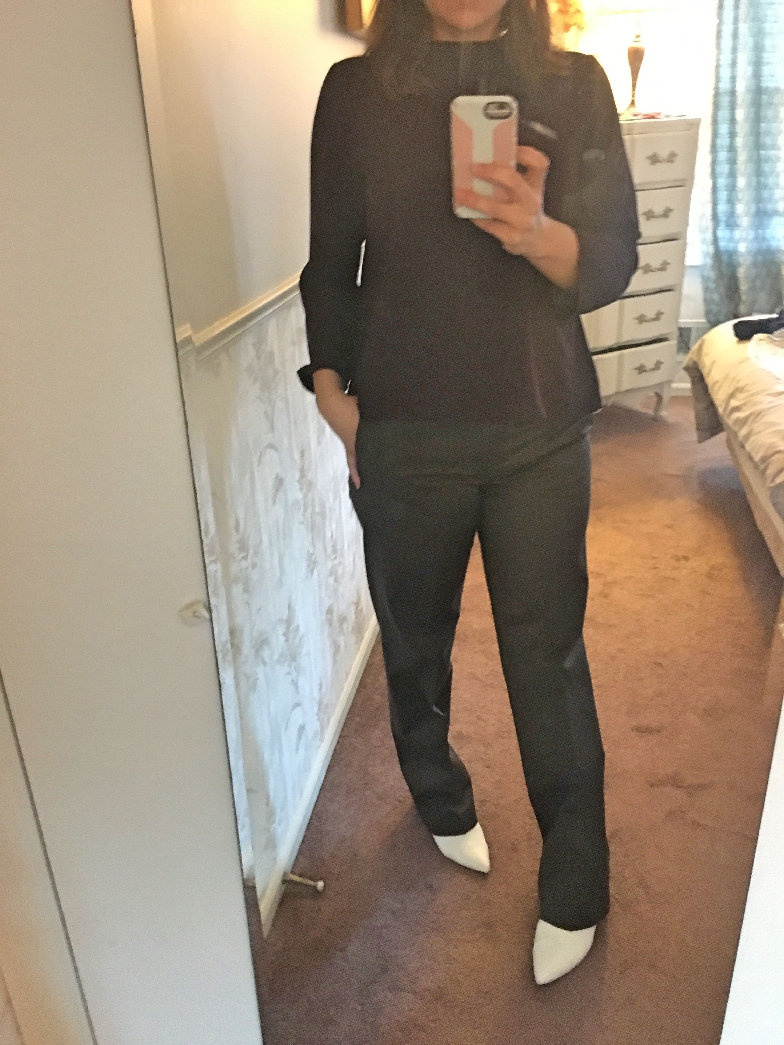 Вот, примеряла в антро бананы и чиновник, все было на размер больше, чем мне надо...бананы великоваты были в бёдрах, пояс как то криво застегивался, плоэтому заказало только чиномСна заднем плане... цветастая блузка моя