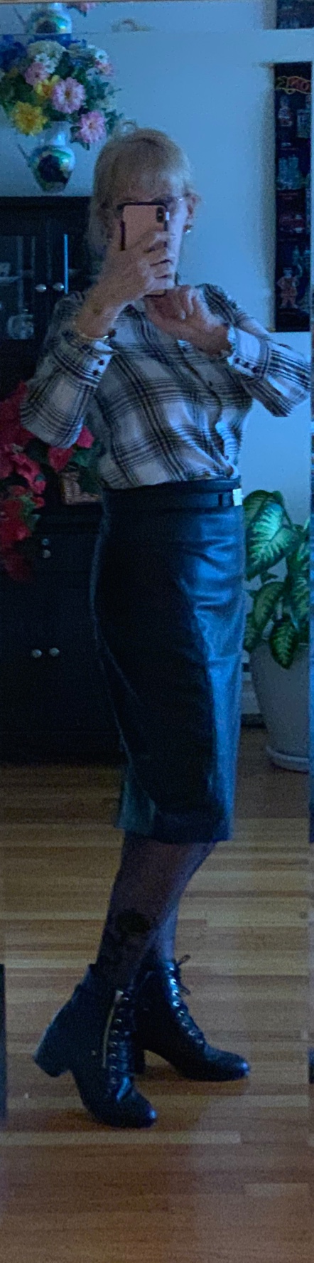 Я бы оставила юбку, но носила бы ее по-другому. Кожа (ну или кожзам в данном случае, но имитирует-то она кожу, надеюсь, хорошего качества? пластичный? колом не стоит?) это утилитарный, рабочий материал и его много, аж целая юбка, самый большой по размеру элемент образа. Ее надо скрестить с чем-то "шикарным". Рубашка в клетку - это тоже рабоче-крестьянский элемент в данном случае, поэтому мимо. Ботинки тоже мимо.
