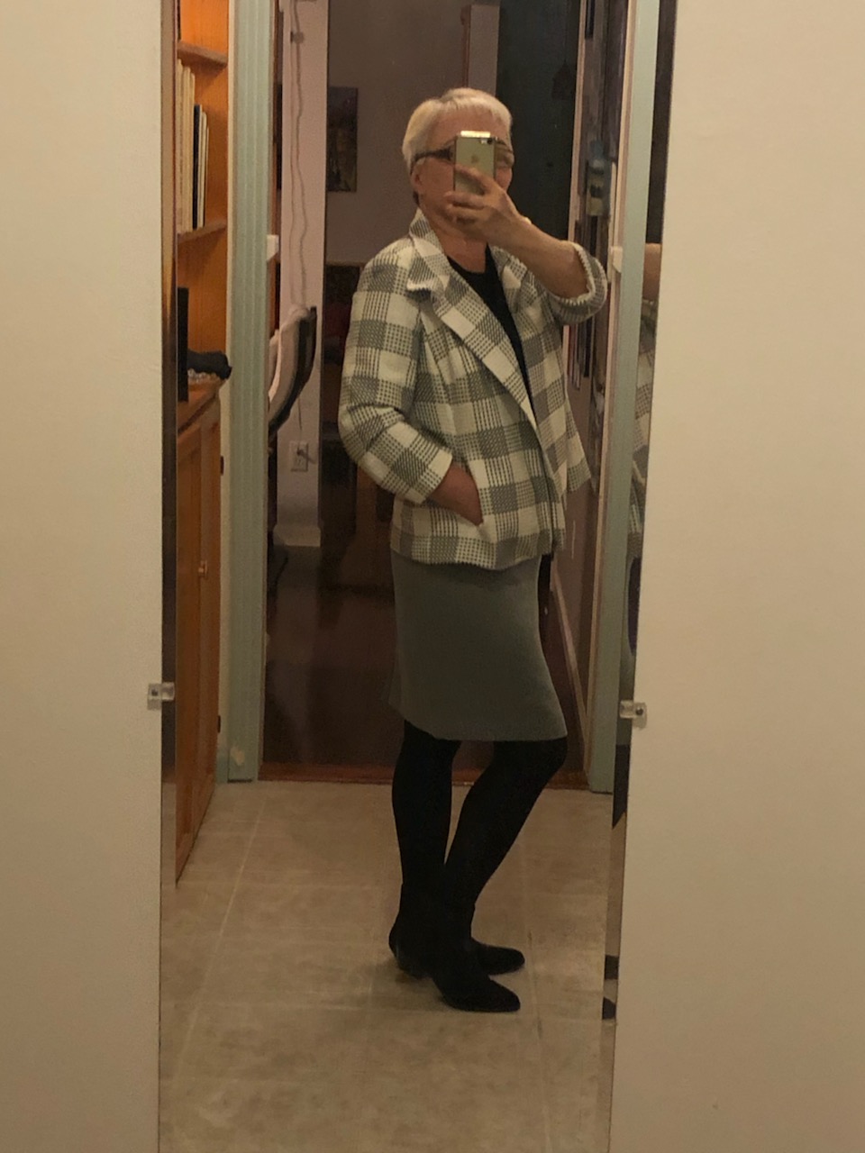 Вот так я завтра собираюсь пойти на деловую встречу. Юбка в мелкую ёлочку. Есть ещё варианты: чёрная юбка, чёрные брюки, чёрная водолазка, серые колготки.