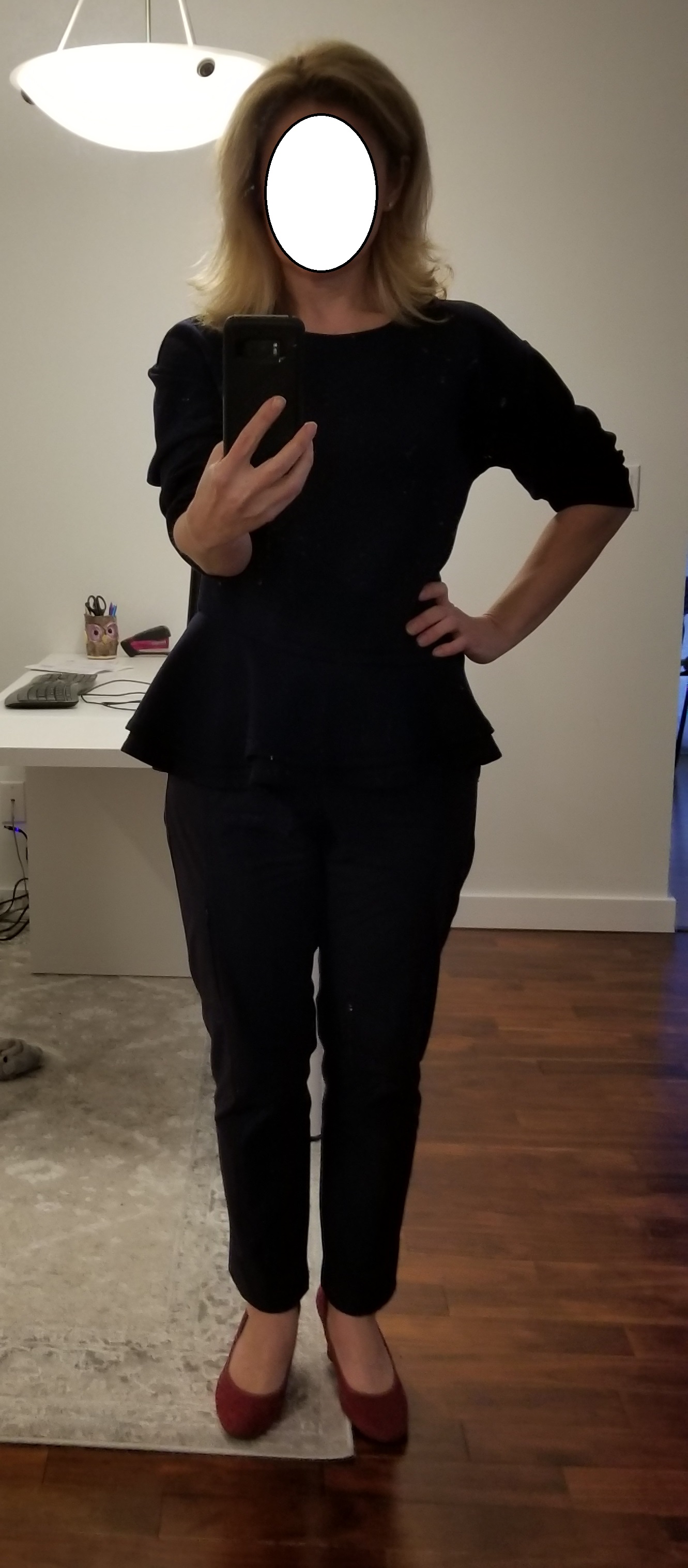 Обещала запостить мой "офисный" аутфит еще в понедельник, но неделька выдалась... Итак, вводная - деловая встреча в фэнси офисе в даунтауне. Задача - не выглядеть иммигрантской лохушкой, выглядеть, как серьезный профешионал. Фотка плохого качества из-за света, он со спины, в следующий раз притащу лампу какую-нибудь что ли.