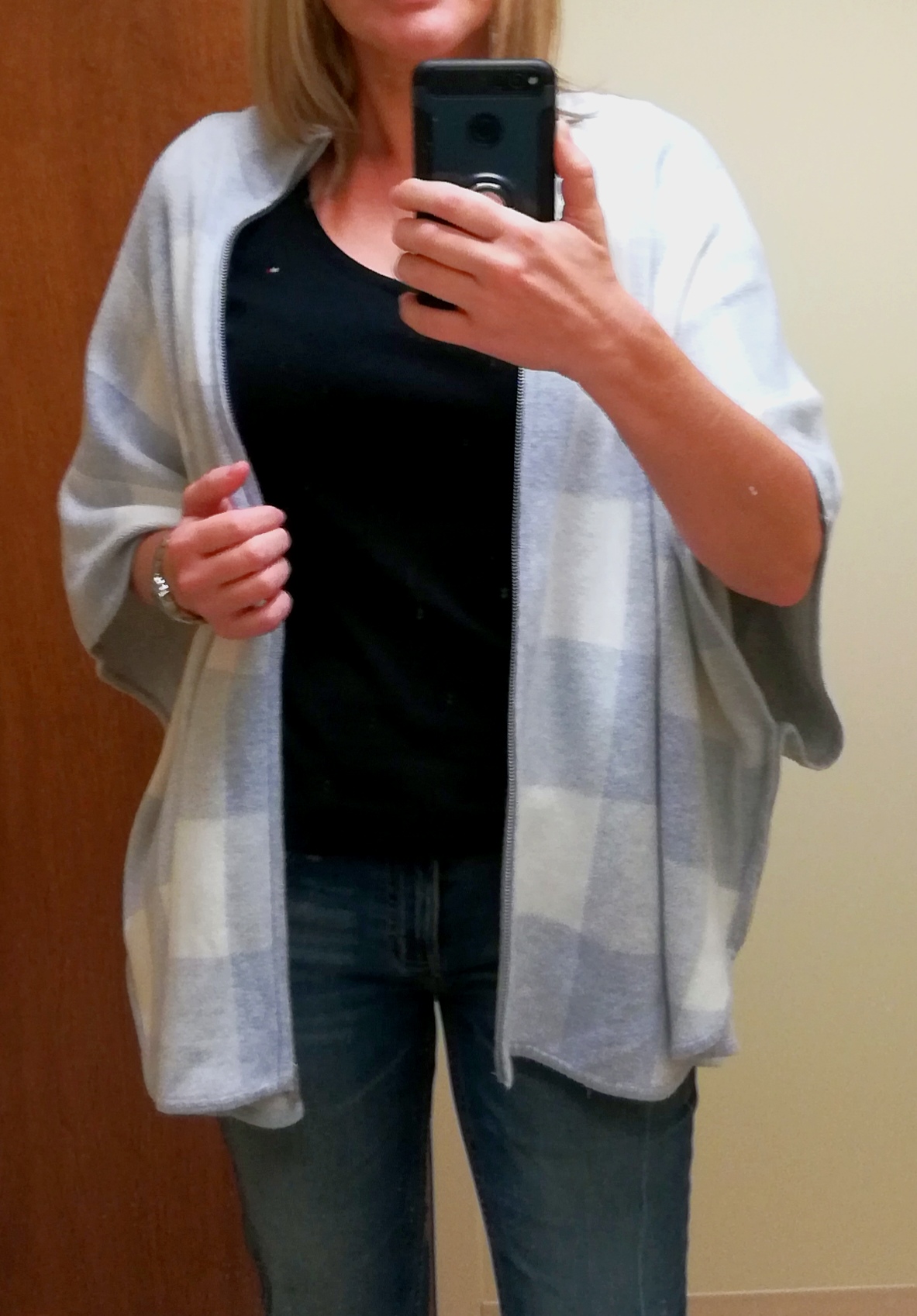 С поясом буду бабой на чайник .... Грудь у меня. Дошла в этом пончо до машины, доехала до работы, по стоянке до офиса дошла, походила в нем минут 30 в офисе, пошла в туалет сделать фото и сняла....жарко. Вот и покупай теплые вещи...пару раз в году надеть, а через год уже не в тренде