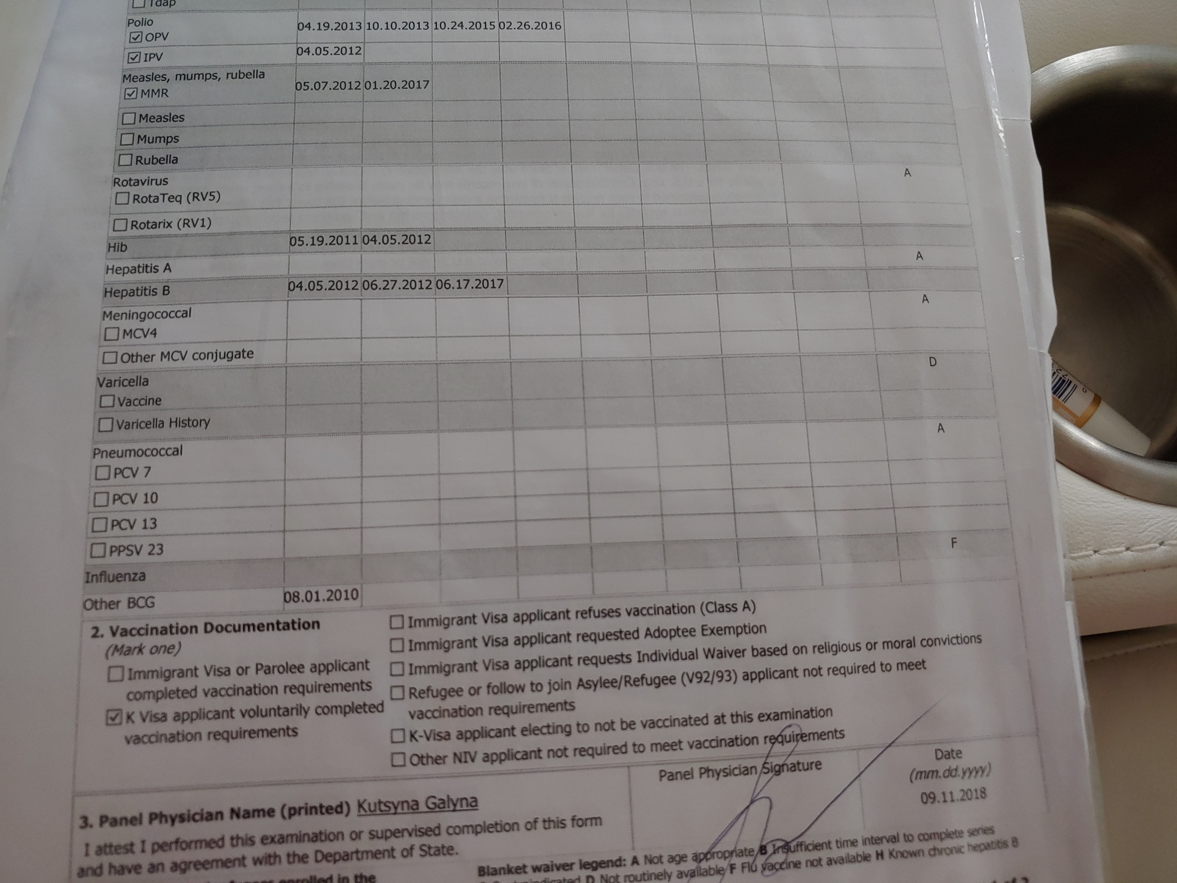 Девочки, помогите советом, проходила медосмотр 11 сентября 2018. Посмотрите на наши справки. даты о ветрянке нет. Только D поставили. Может кто знает одобренного доктора в Мичигане? Я обзвонила почти всех. они хотят 300долларов за перенос только и толдычут мне о медосмотре. У нас не такой комплит как на фото ранее. Это вообще комплит? [/img][/img]