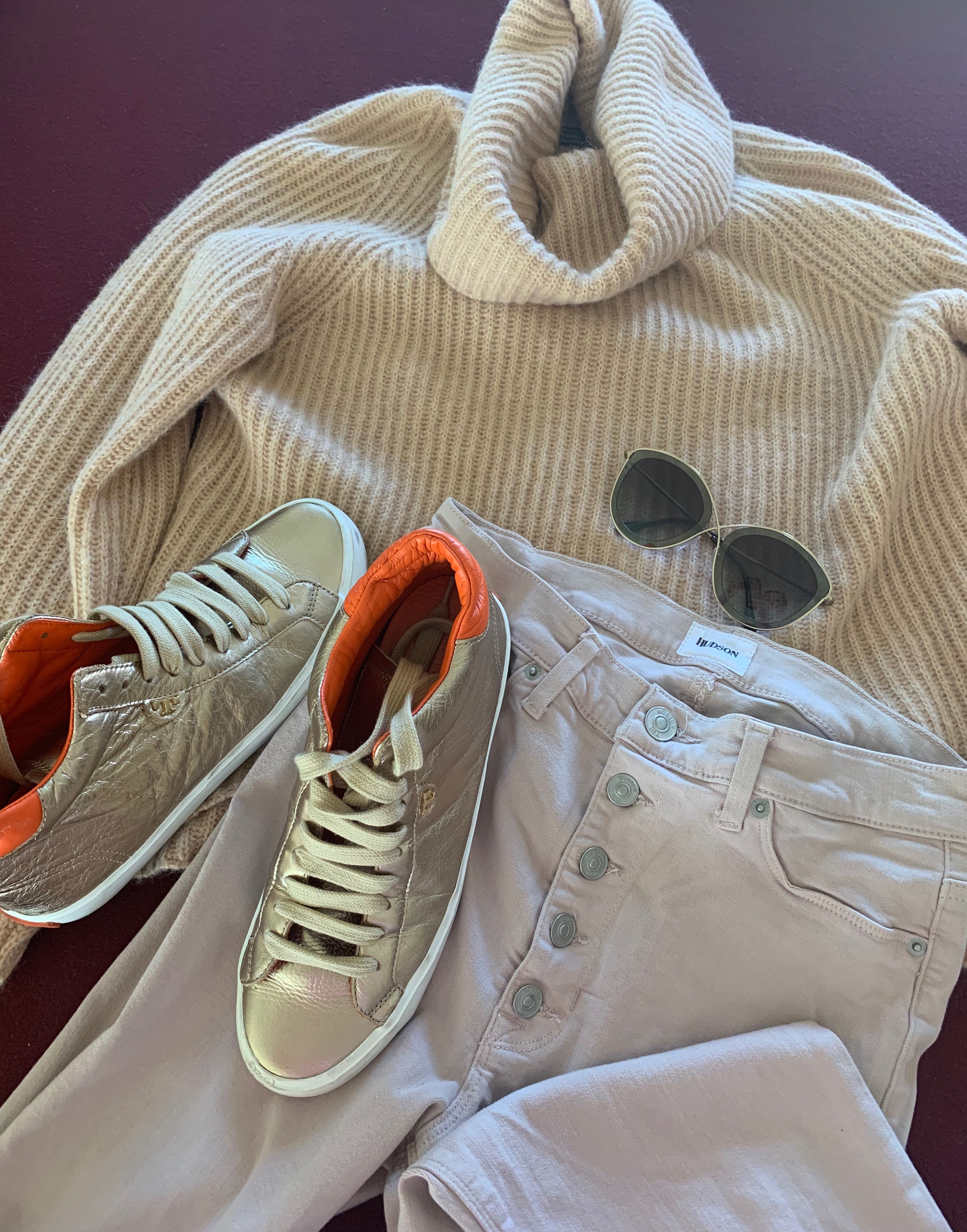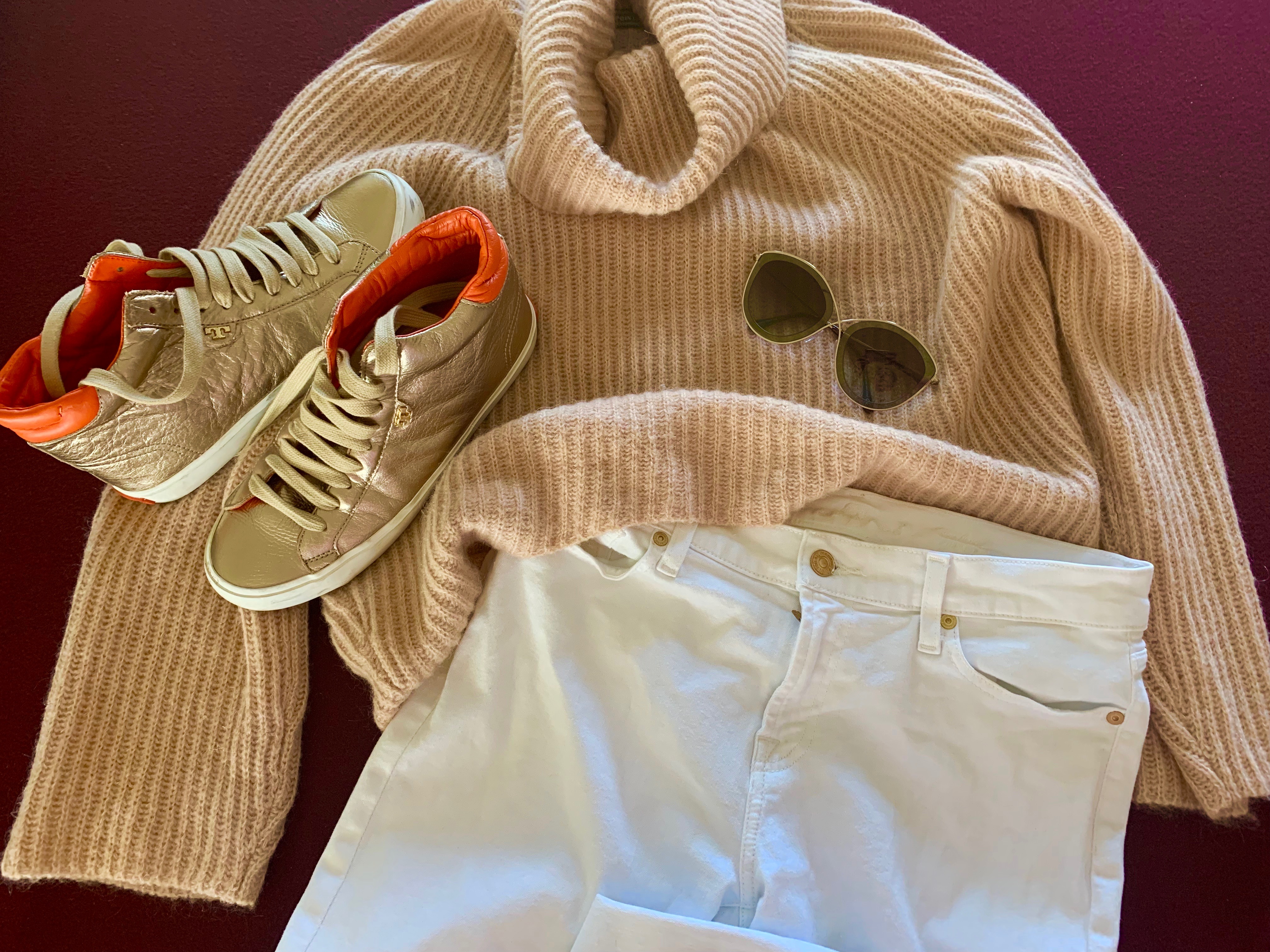 с белыми джинсами. Свитер кстати цвет в цвет попадает с шузами