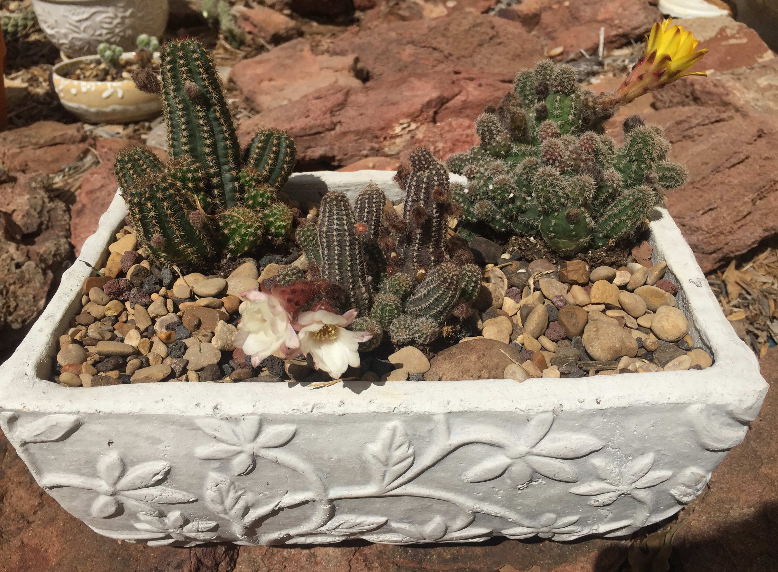 Lada_T писал(а): Красота какая у всех! Спасибо что делитесь! monaliza писал(а): Флоксы насколько я помню из детства, соцветиями, а эти порознь. Пахнут наверное как флоксы, но не удушающе. Очень нравятся из за цвета, все таки синий в цветах всегда в дефиците. Монализ, флоксы, котоыре в России в букеты собирали, это один вид, а тут много других, вон хоть Сreeping Phlox, про который не раз тут говорили - уж совсем почти ничего общего с нашими привычными. однако - флокс. У этого форма цветка и бутона и даже сама кисть вполне себе традиционная, рыхлее только, листья тоже. ------------ Вчера сгребла в Волмарте три цветущих кактусика, одинаковые, но цветы разного цвета (белый, желтый и красный) , поэтому не стала даже мучиться выбором  Цветки достаточно крупные и их много (я поотрывала отцветшие), и еще бутоны остались, попросила мужа дырку просверлить в вазоне и вуаля. Не хочу какты держать без дырки, приходится или под крышей, или таскать, а это скучно, а с дыркой куда угодно на улице поставить и радоваться. Орхи в закрытой системе прекрасны, а вот с сукками-каками я как-то колеблюсь.