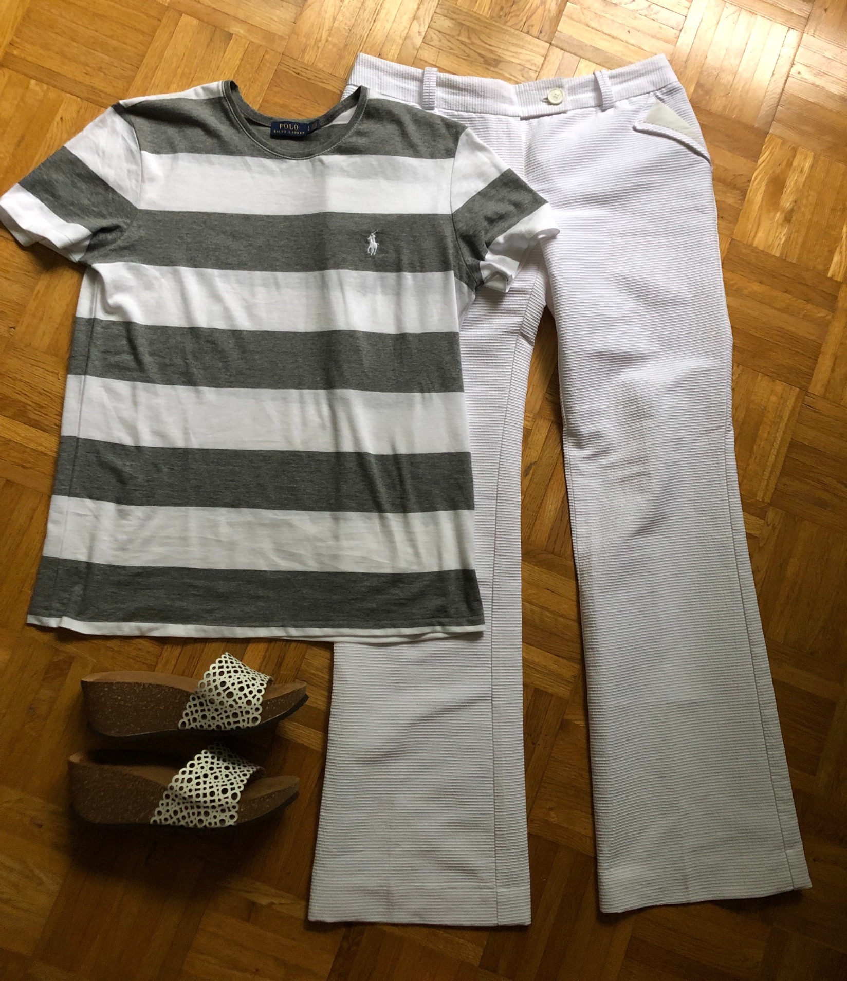 Как тут не похудеешь, брёвна перетаскивая.  Сбросила пару паундов, стала в прежние штаны влезать. Джои, я не высокая, 1,64. Просто зеркало так удачно встало, да и клёш с танкеткой удлиняют. Если "весчь" очень сложная или цвет неудобный, то я не беру, даже если очень нравится. Висят уже такие, глаза мозолят и напоминают. Стала покупать, если точно знаю к чему. Не хочу захламляться.