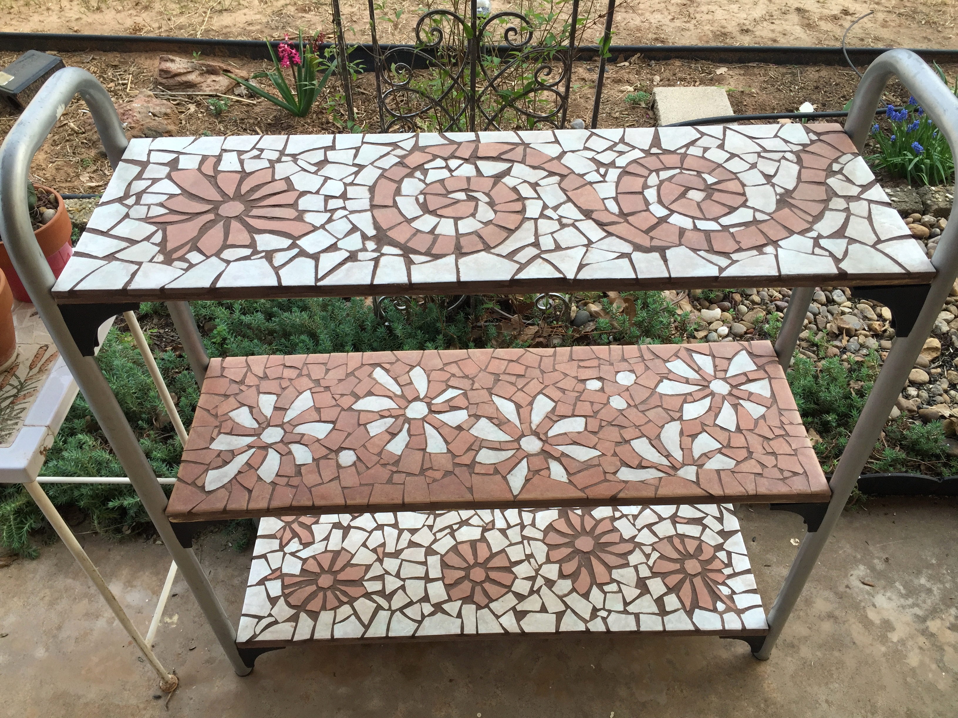 Пулечка, очень интересно!  Я что-то пропустила, видимо - ты сама шьешь это? Я тут опять со своей плиткой, битой и недобитой Заглянула в магазин. на вывеске которого даже слова *плитка* не было, только карпеты и хардвуд, но я была поблизоски и заглянула. И спросила...Меня вывели на задний двор и я офигела - там поездом вывозить надо было, причем много что просто целыми ящиками (тоись ниразу не битое). Забирай че хошь. сказали. И когда хошь. Набила свой баражник от жадности всяким-разным Вобщем продолжаю пока практиковаться на небольших кусках мусора. Была подставка для цветов, старая разваливающаяся этажерка из ДСП. Давно хотела выбросить, но что-то удерживало. Горшки с цветами ставить куда-то на улице надо все равно, все думала - заменю полки, может че поприличнее получится. Вот настал ее звездный час  Правда, тяжеловатая, надо как-то колесики бы приделать, особенно с горшками уже двигать неудобно.