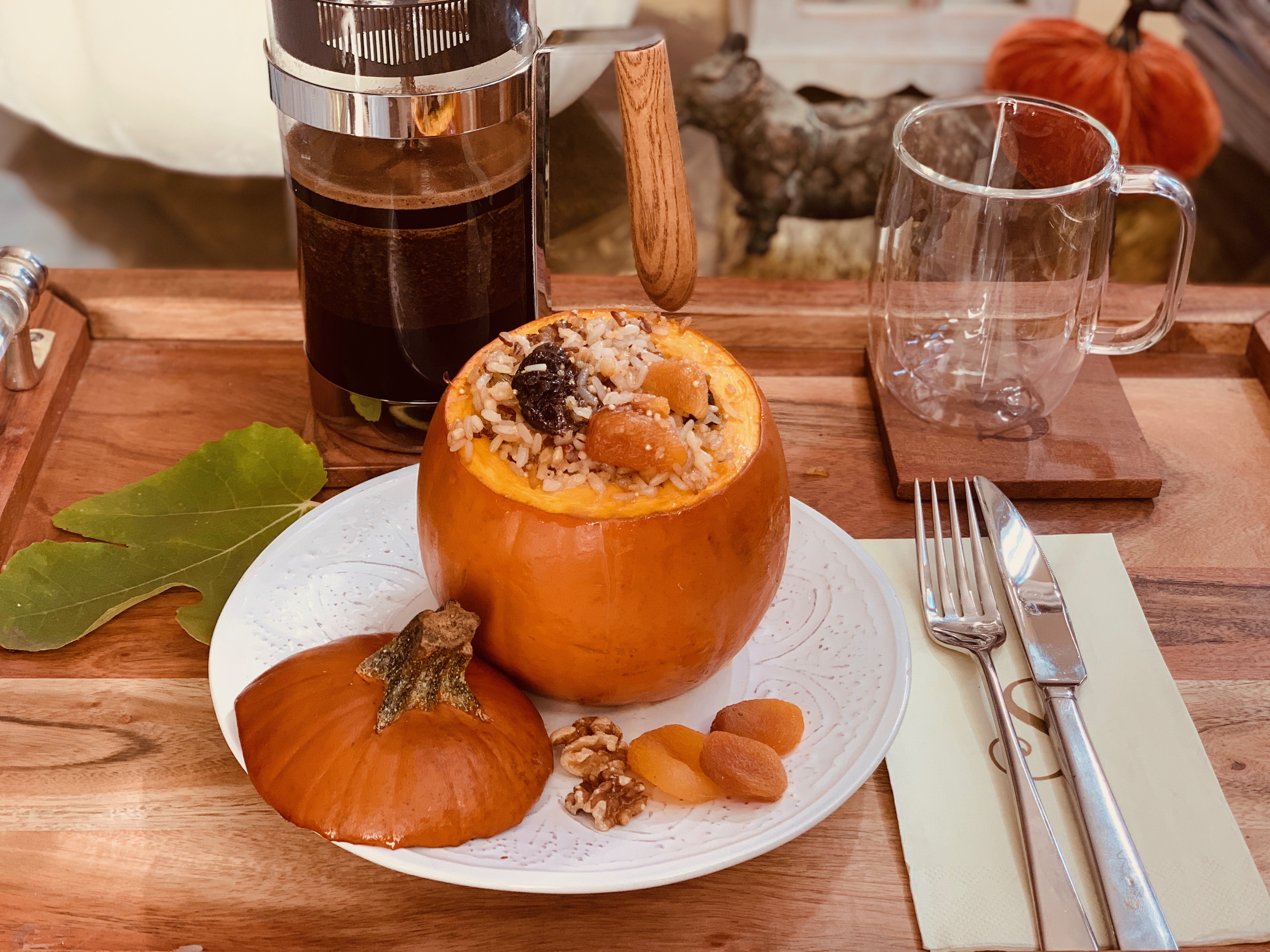 Тыква с кашей и Костко, с сухофруктами, орехами, кокосовым молоком, медом, приготовлена в духовке