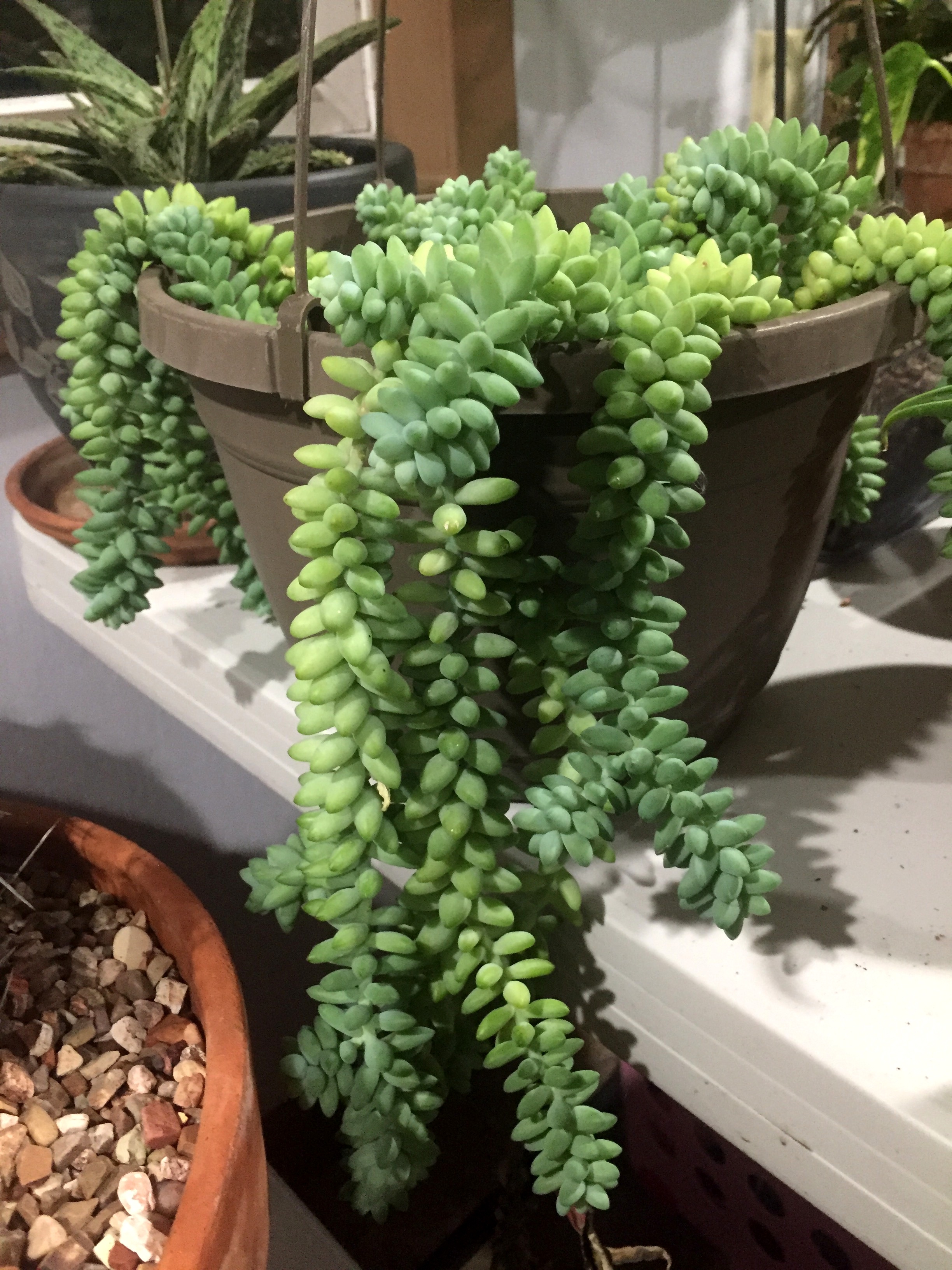 nevera писал(а): Оклахома а сколько лет твоему седуму Моргана? Чем подкармливаешь? Он тоже в камешках растет? Моему 3года- вроде все условия выполнила-свет, полив,подкормка-а он, как говорится-не мычит,не телится. наверно буду избавлятся, место хорошее занимает, а толку мало.  этот был совсем молоденький - год назад только обрезала ветки у другого и повтыкала вот в горшок. Они быстро пошли в рост, что необычно для него, да. Были при посадке сантиметров по 10, торчали все, вот это за год они вымахали...был красивый...ну, сейчас там весь грунт усыпан листочками, потихоньку укоренятся, закроют срам  Жаль, не занесла, но что теперь ...Это вот фото зимой - меньше года от укоренения.Но хоть материнское растение цело. Сейчас цветет. Висели оба не на солнце - с восточной стороны дома, солнце только утром немного попадало. ничем не удобряла. Сажала в грунт для кактусов. Может и надо подкармливать, но, как и все сукки - очень осторожно. Первый год земля была свежая - хватило всего и так. В общем я особо советов дать не могу - у меня просто сразу он хорошо пошел, без бубнов. Хочется эти длинные толстые сосиски отрастить и вот еще кактус сегодня распустился