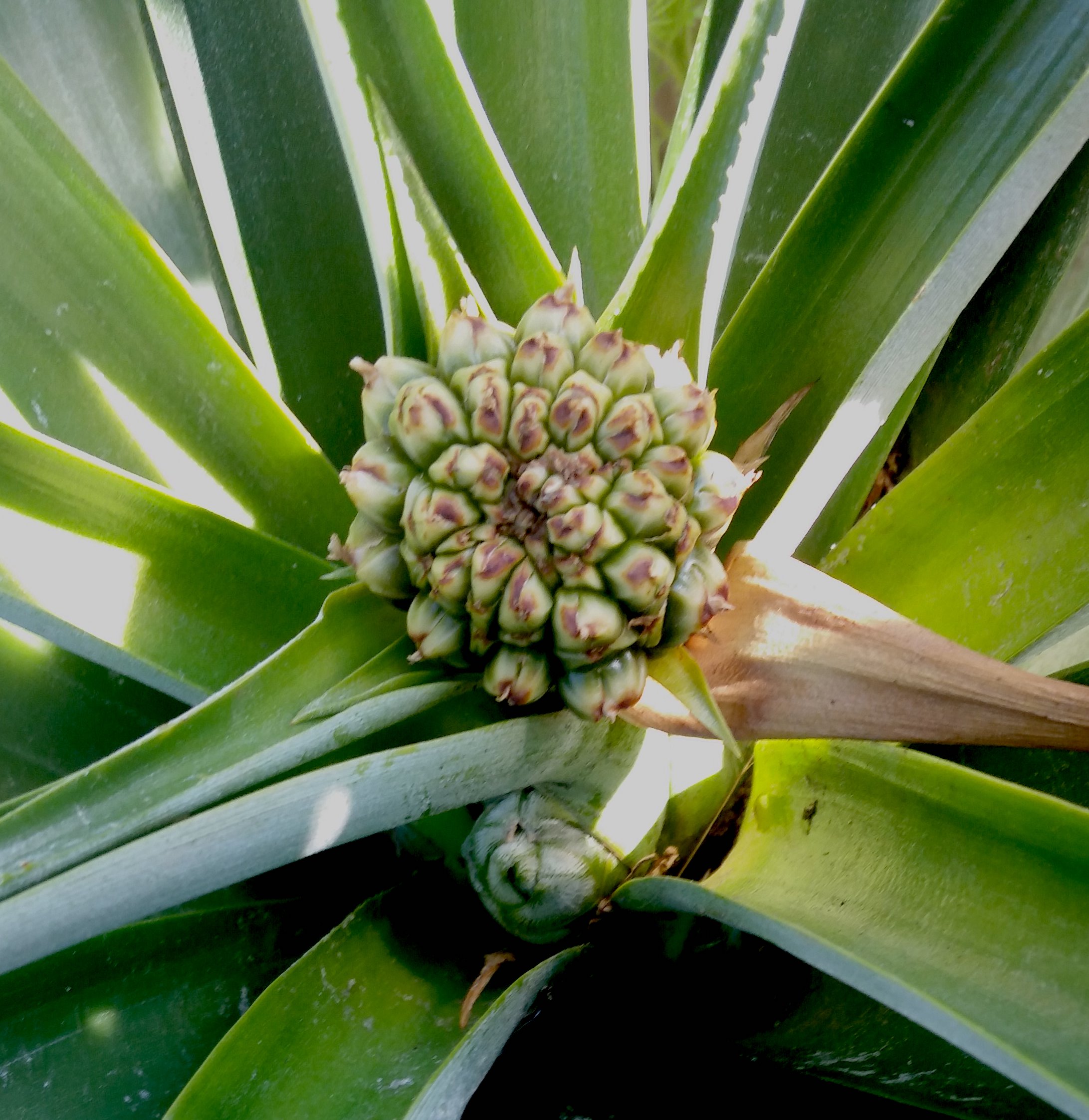 Тот лысый ананасий так и не выпустил верхушку, хотя почки растут, и детки на стебле лезут.