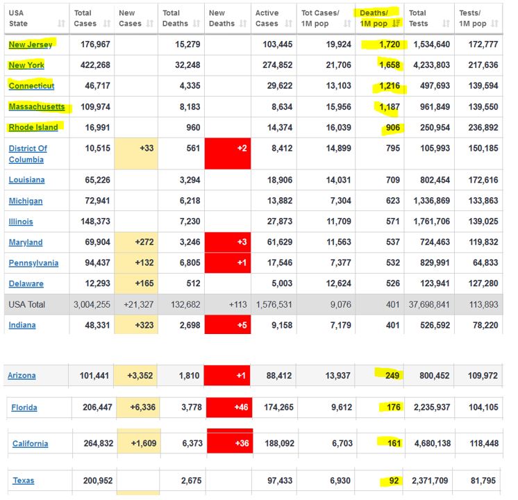 Anastacia писал(а): Только что услышала инфу (ещё не проверяла), что Нью Джерси занимает первую позицию в стране по количеству умерших от осложнения ковида в стране из расчёта на 1 миллион человек. Следом - Нью Йорк. А Техас и Флорида по количеству смертей на 1 миллион населения - далеко отстают от этих двух Штатов. Кто что слышал или читал по этому поводу?  Отсюда https://www.worldometers.info/coronavirus/country/us/#ref-7 и совершенно аккуратная информация. Взята из официальных источников, в удобном формате. На первой странице чемпионов нет ни Флориды, ни Техаса, ни Аризоны, ни Калифорнии, их надо скролить вниз, Техас почти в самом конце. Зато кому от сми досталось? СМИ хоть один раз сказали, что в нью джерси самая высокая смертность per capita? 1,720, когда в Техасе 92. Почти в 20 раз разница. Раш Лимбо сегодня говорил, как сми дурят всем головы.