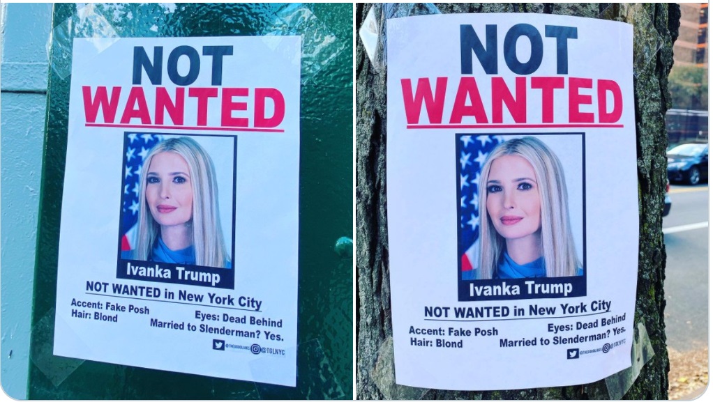 Posters have popped up around New York featuring Ivanka Trump’s face and the prominent words “NOT WANTED” in a clear effort to troll the Trump daughter as the family prepares to be ousted from the White House. The posters, put up by comedy duo Jason Selvig and Davram Stiefler who are known as “The Good Liars” on Twitter, also include some amusing details such as an accent described as “fake posh” and eyes as “dead behind.”