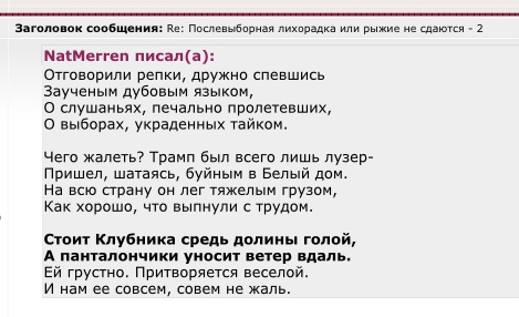 NatMerren писал(а): Маленьким репкам Грустно зимой. Репок-стукачек Слышен скорбный вой. Кепки МАГА надели, Встали в хоровод, Гневом и яростью Встретят новый год Сколько у репок Слёз наливных, Трампа провал Прямо им под дых. На елке нарядной Трампик висит, Руди потеющий Глаз веселит. Путин румяный Сияет звездой Репки, не плачьте, Валите домой! (В Россию)  вагончик тронется, вагончик тронется..