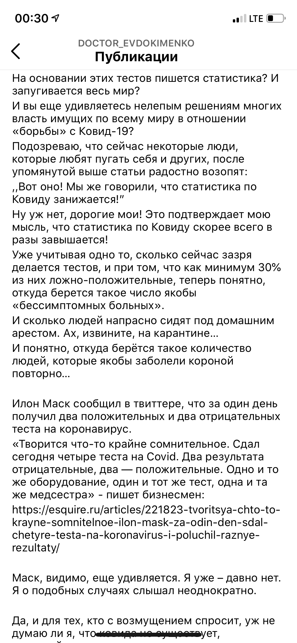 На каком основании вы мне пишете что у меня кукуха поехала . Лишь на том основании что мое мнение не совпадает с вашим ? Из за того что я не верю что тесты на ковид показывают правильный результат ? И что маски антинаучны. Так это ПРАВДА , об этом сейчас пишут тысячи врачей которых не допускают на ТВ . Вот например . Врач ревматолог невролог , высказывает своё мнение , а так же мнение своих коллег . Пишет в своём блоге что тесты показывает правильный результат на 50% . Что пандемия раздута , цифры притянуты за уши . Что многие бессимптомные больные не правильно лечились, в результате такого « лечения» получили осложнения и даже смерть . Искусственная паника создала огромный поток пациентов , бессимптомных, с орв, с гриппом . По началу вообще лечили всех и не понятно чем !!! Доктор пишет что солнечный свет , витамин д необходим и важен , необходимо гулять и контактировать с людьми . Пишет что не верит что маски сдерживают вирус . Это говорит врач , если вам это так важно. Вот ещё врач хирург пишет об этом же , в прикреплённых фото . Вот ещё человек пишет ( прикреплённых фото его страница) - президент лиги пациентов ; пишет что в России каждый год умирает от пневмонии от 42- до 50 тыс человек , что несколько сот человек заболевает гриппом каждый день, это было есть и будет . Ничего нового , что корректировки о масках и прочие поправки Роспотребнадзор вносил ещё с 2019 как подготовку. Что ВОЗ частная компания , что хотят и делают и прочее почее. То что ни делают это вообще антиконституционно. Вот ещё молодой врач ведёт блог . Есть мнения огромного числа юристов . Все они конечно такие же идиоты , как и я . Главное - это образование , у них его конечно же , этого образования нет . Депутат Австрии сделал тест на короновирус КоКа Коле прям в эфире и тест был положительным , он тоже дурак и неуч??? В Танзании коронавирус нашли у козы и в папайе