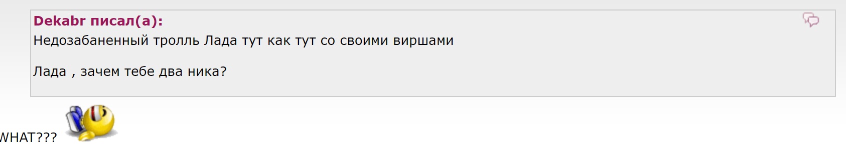 Lada_T писал(а): Декабрь ты говори да не заговаривайся А про ники не тебе интерогировать уж точно Я прекрасна помню когда ты из новой в декабря превратилась А когда тебе намекнули мол мы чего мать ? такая хлоп ресницами я не я и хата не моя  Да, я меняла Ники , но одновременно под двумя никами и сама с собой , как Линда с НатМеррен не вела беседы ))) Ник поменять не проблема , люди меняются , но писать одновременно под двумя никами ? Да ещё и самой себе ?