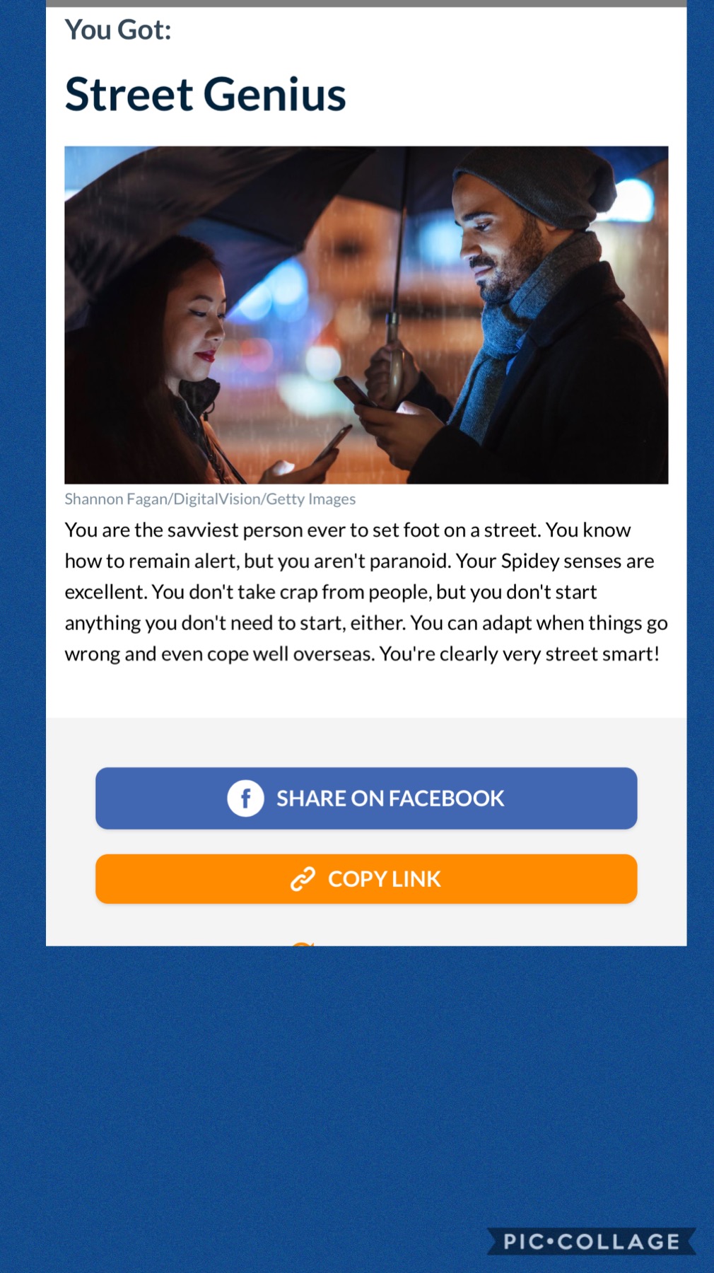 Betty123 писал(а): Ваше определение? Это кто? Это я You Got: Street Genius You are the savviest person ever to set foot on a street. You know how to remain alert, but you aren't paranoid. Your Spidey senses are excellent. You don't take crap from people, but you don't start anything you don't need to start, either. You can adapt when things go wrong and even cope well overseas. You're clearly very street smart!