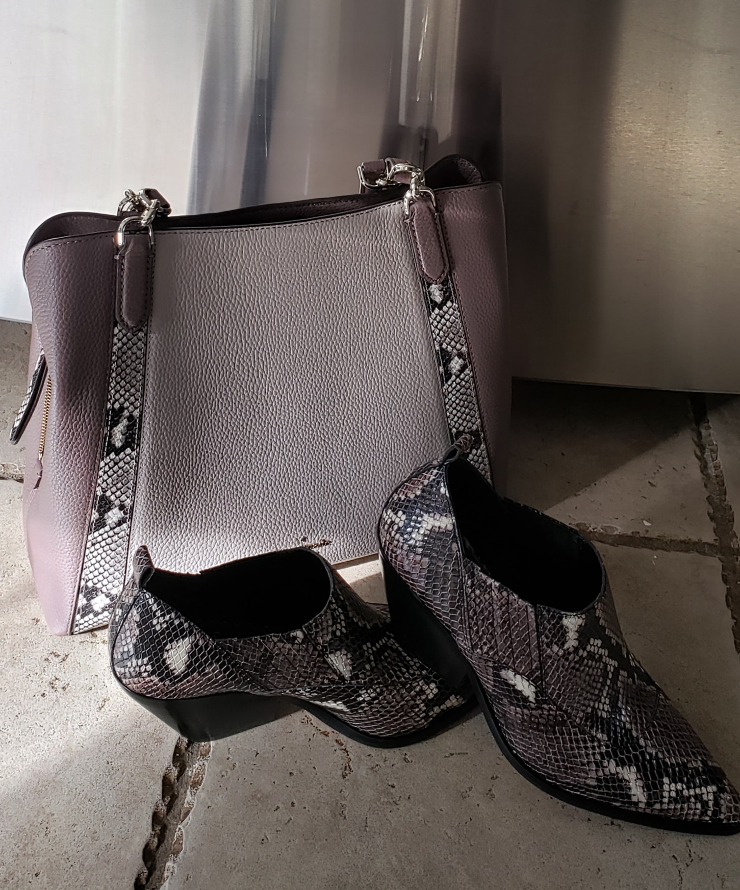 Бейли  . Симпатичный комплект, прямо как созданы друг для друга  . Приятные оттенки и серого и розового,( если только камера правильно передает). Те,что я сдала, белые - на низком каблучке. А эти змеиные - на среднем. И кроме того твои даже не ботинки,а что-то среднее между ботинками и туфлями. Должно быть классно с буткатами  . Интересно - удобные они при ходьбе ?