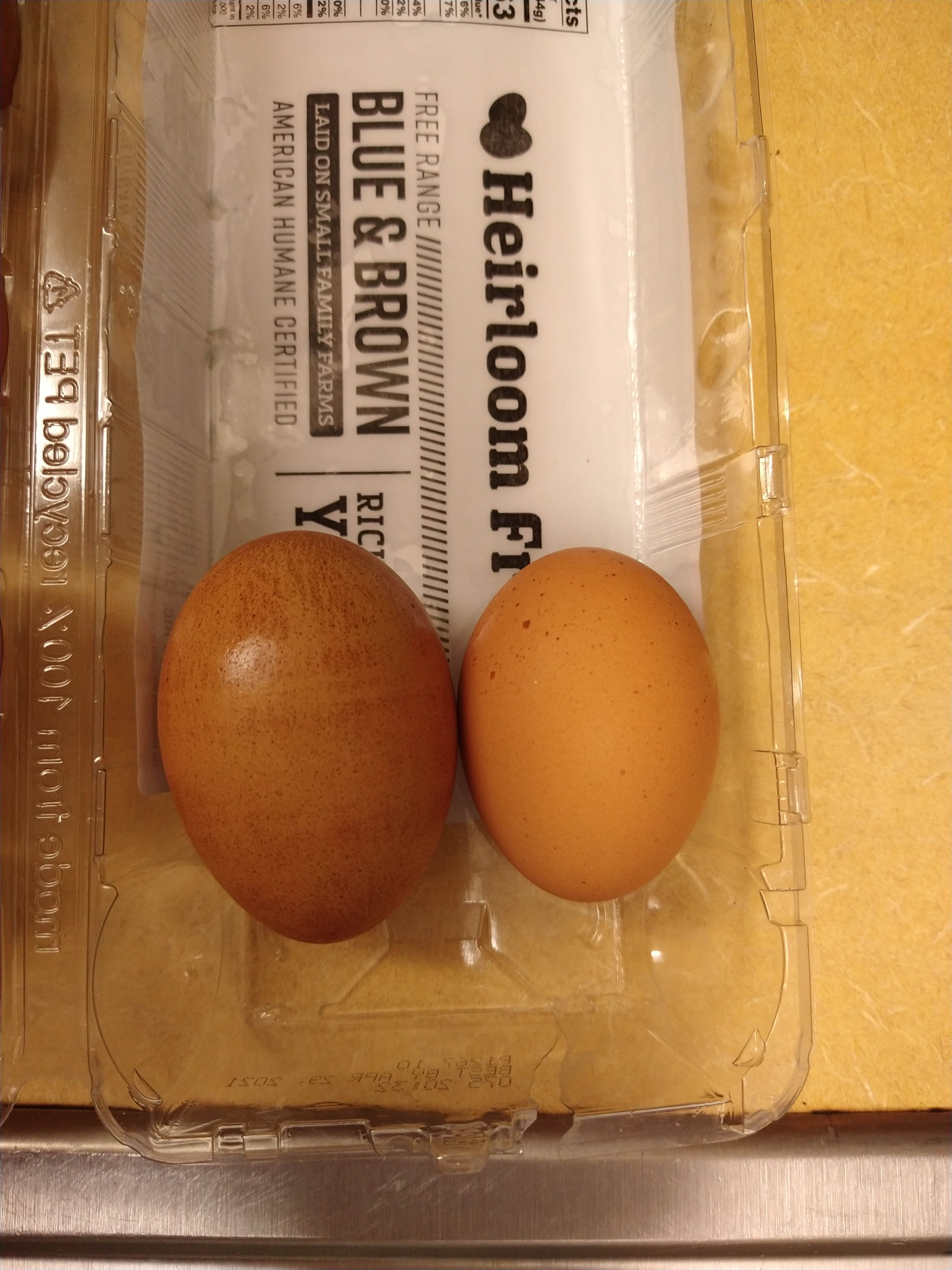 Фото для сравнения, то что больше, то medium. Из трех яиц одно новое, цвет желтка виден.