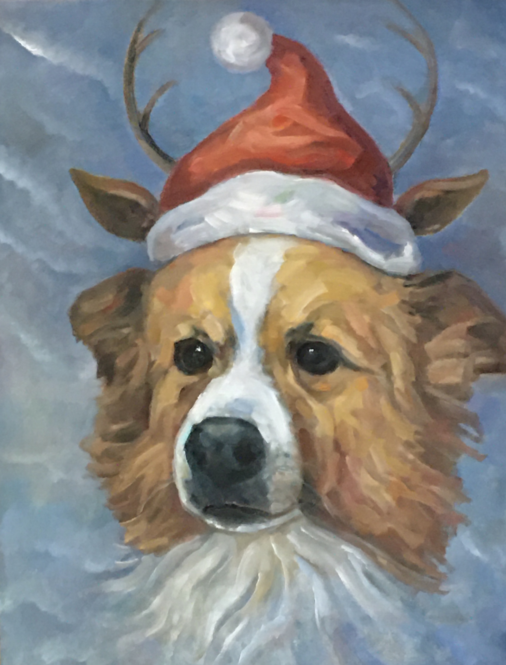 Вот ещё из законченных, но тут масло. Собачка по просьбе хозяйки в шапочке.