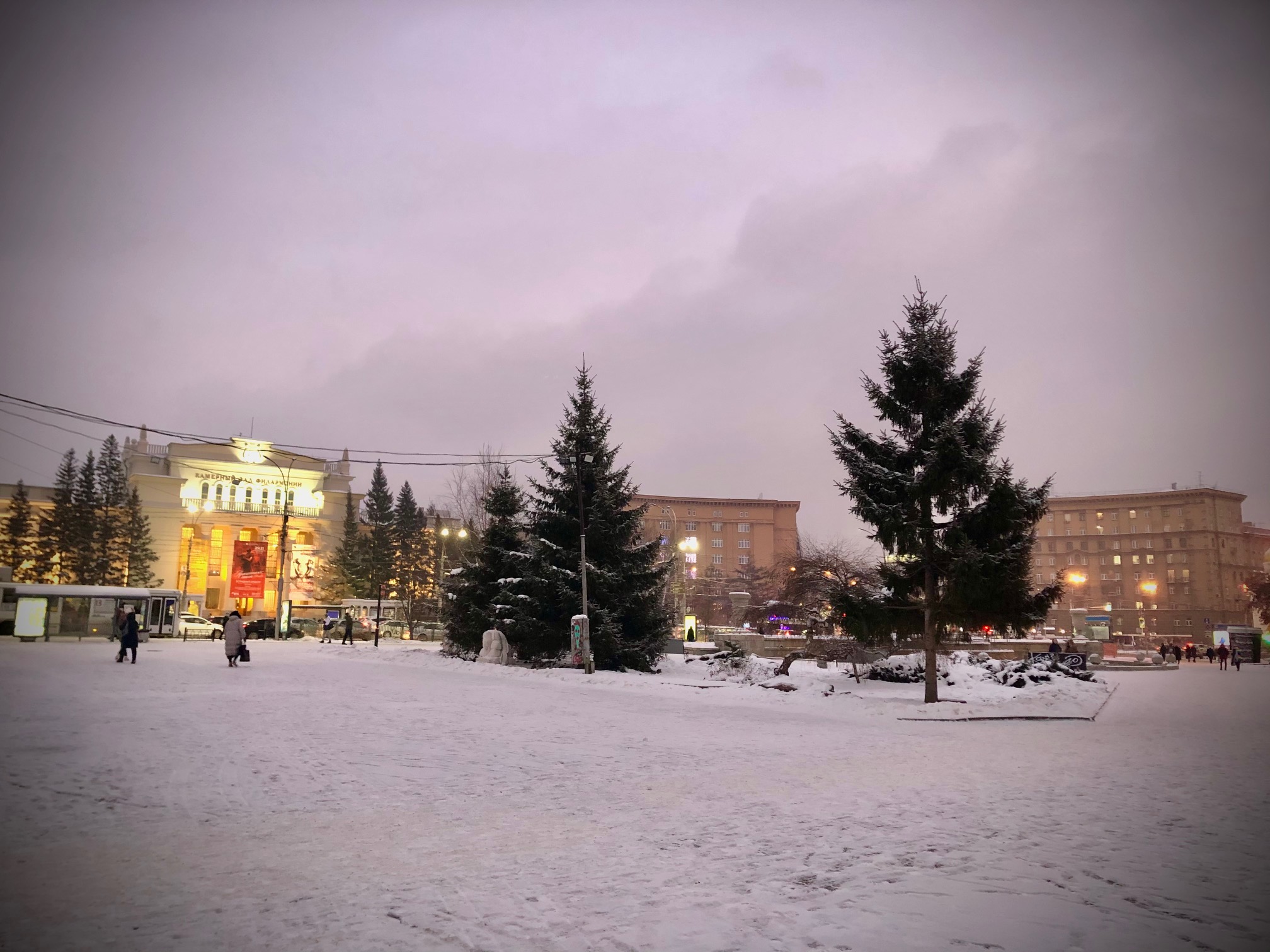 снег, улицу, фонарь, березку что еще нада русскому чеку