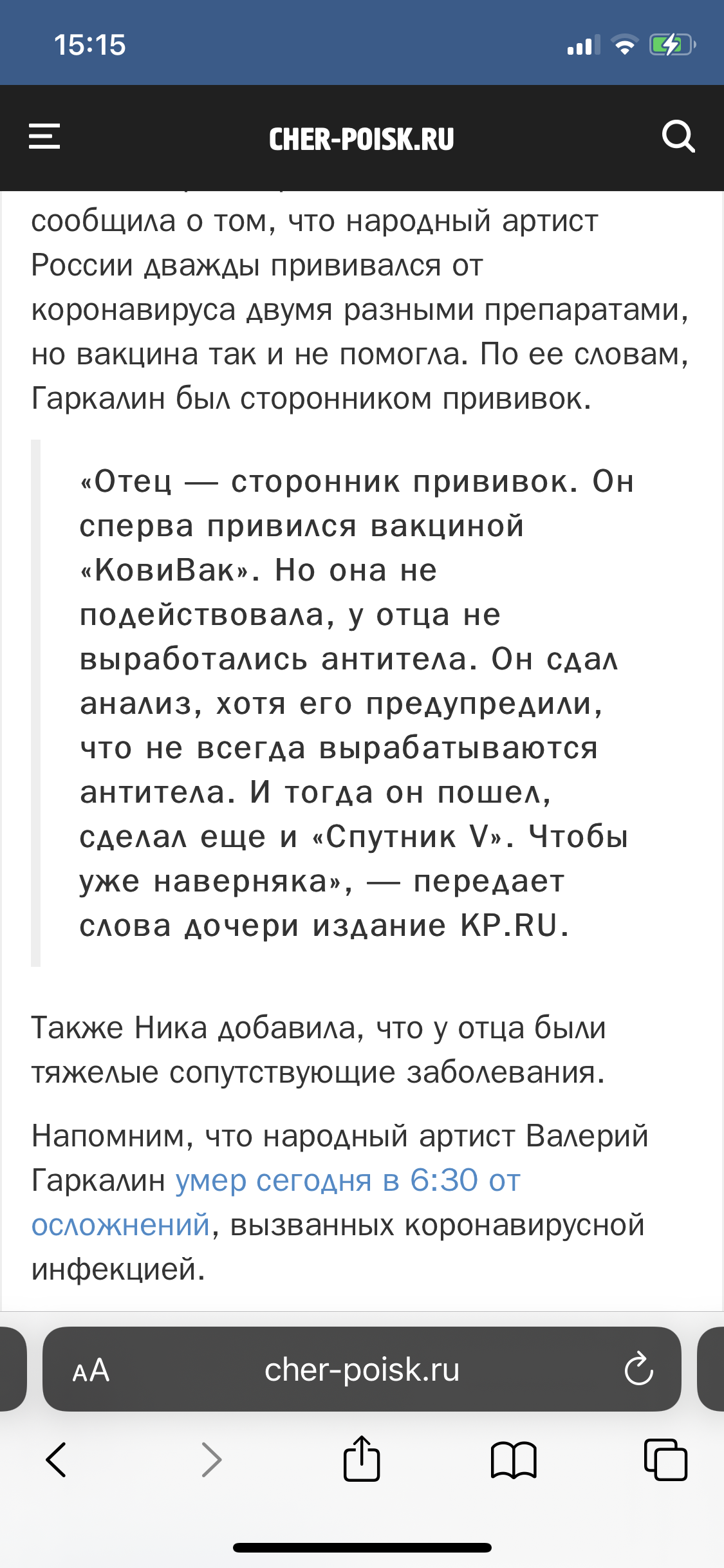 В доску заколотый прививками от короны актёр Валерий Гаркалин умер от короны . Дочь Валерия Гаркалина Ника сообщила о том, что народный артист России дважды прививался от коронавируса двумя разными препаратами, но вакцина так и не помогла. По ее словам, Гаркалин был сторонником прививок. « Отец — сторонник прививок. Он сперва привился вакциной «КовиВак». Но она не подействовала, у отца не выработались антитела. Он сдал анализ, хотя его предупредили, что не всегда вырабатываются антитела. И тогда он пошел, сделал еще и «Спутник V». Чтобы уже наверняка», — передает слова дочери издание KP.RU.Также Ника добавила, что у отца были тяжелые сопутствующие заболевания. Напомним, что народный артист Валерий Гаркалин умер сегодня в 6:30 от осложнений, вызванных коронавирусной инфекцией. Полная версия: https://cher-poisk.ru/news/obschestvo/valeriy-garkalin-privilsya-dvumya-raznymi-vaktsinami-no-oni-emu-ne-pomogli Ну где вы курочки кудахчащие как ваши прививки спасают жизни ????