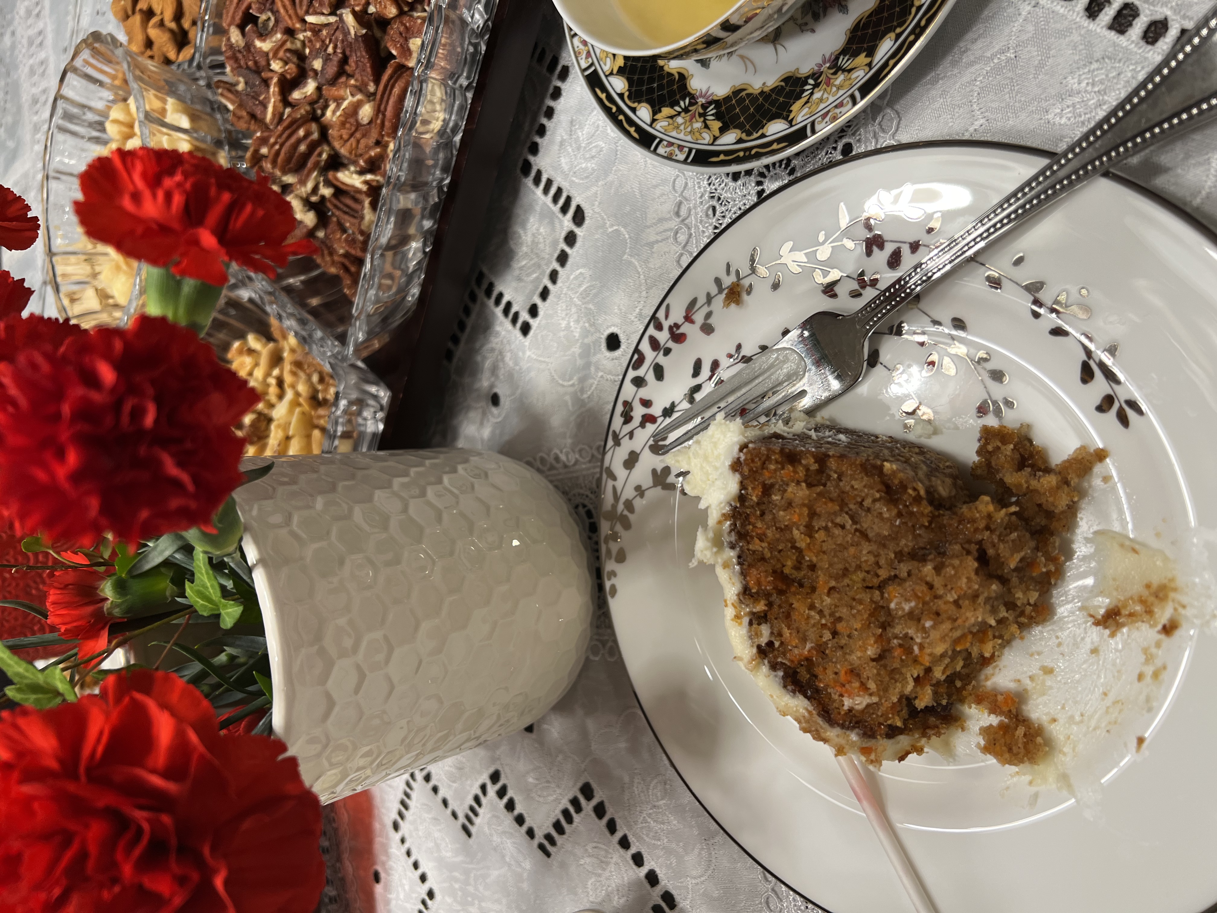 Торт морковный - вкусный. Вы его с cream cheese frosting делаете? А ещё мне нравится Ваша скатерть.