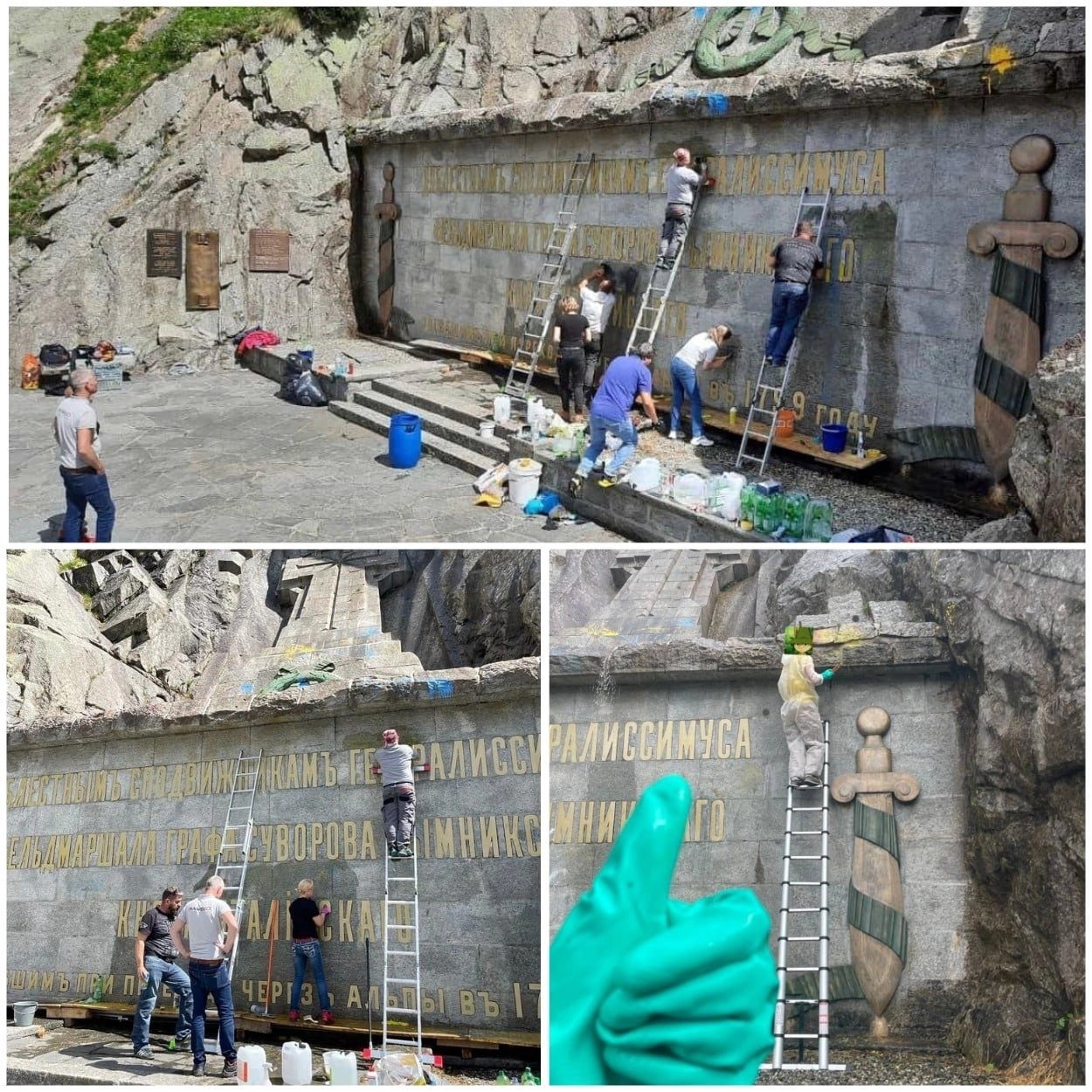 Простые швейцарцы заботливо отмыли оскверненный украинской символикой памятник Суворову в Альпах и принесли цветы 12-метровый крест в скале — в городе Андерматте ранее был облит вандалами желтой и синей краской. Также неизвестные нанесли в нескольких местах украинский герб. Власти кантона Ури заявили, что приведение мемориала в надлежащее состояние не их забота и формально они правы — монумент принадлежит России, как и кусок земли под ним, размером около 500 квадратных метров. К счастью, формализмом, а заодно и забывчивостью (российский генералиссимус, фактически, спас Швейцарию от орд французов) не страдают неравнодушные местные жители. Они скооперировались и отмыли памятник Суворову. А позже принесли цветы и зажгли свечи в память о подвигах русского солдата.