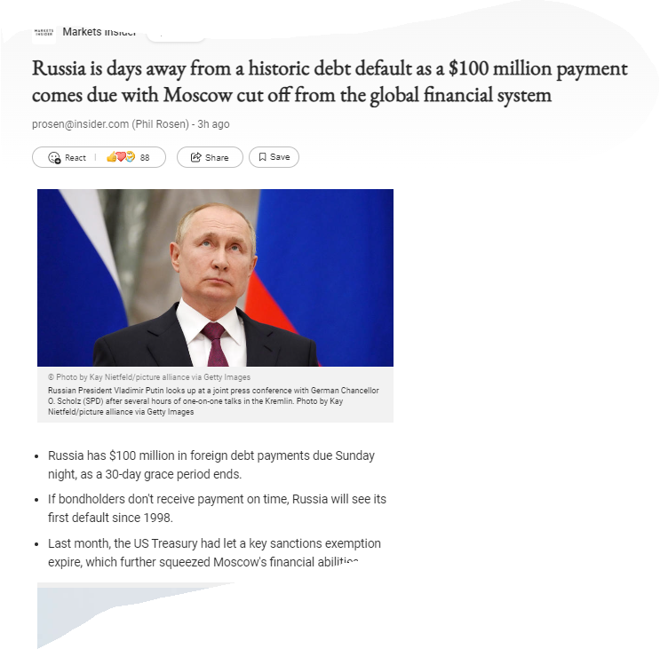 https://www.msn.com/en-us/news/world/russia-is-days-away-from-a-historic-debt-default-as-a-100-million-payment-comes-due-with-moscow-cut-off-from-the-global-financial-system/ar-AAYPhKm?ocid=msedgntp&cvid=1b47bd881b914f62938cc015e32199bf