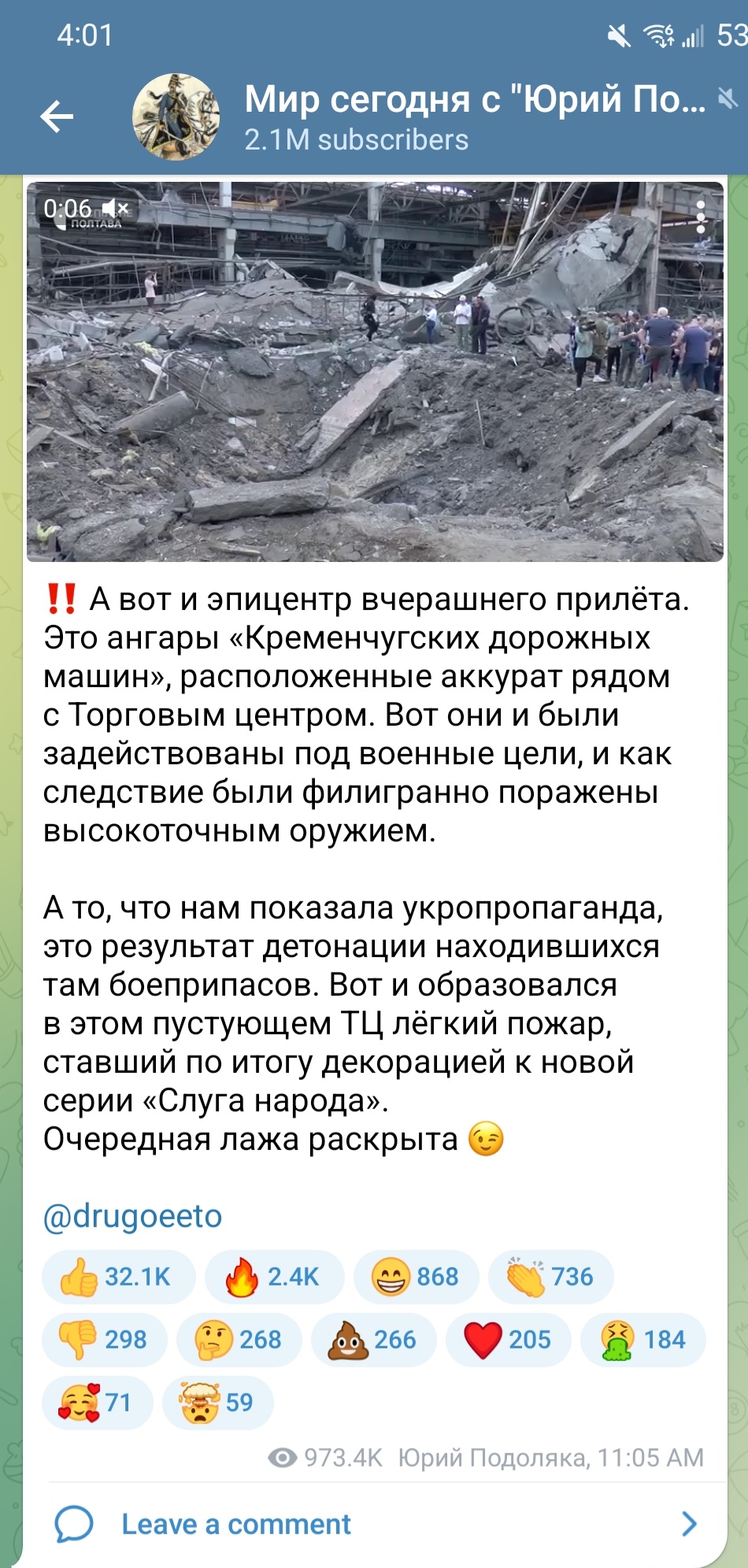 Эти ублюдки продолжают клепать фейки и провокации Кременчуг, Киев.... В Киеве ракета очень точной наводкой летела на завод. Ну браво, укры сбили ракету над жилым домом. Дом, пустой. Давно из него все выехали. Ну и строить жилые дома рядом с такими заводами, это что то Да мало ли было подобных провокаций.... буча, Краматорский вокзал.... и столько ещё будет