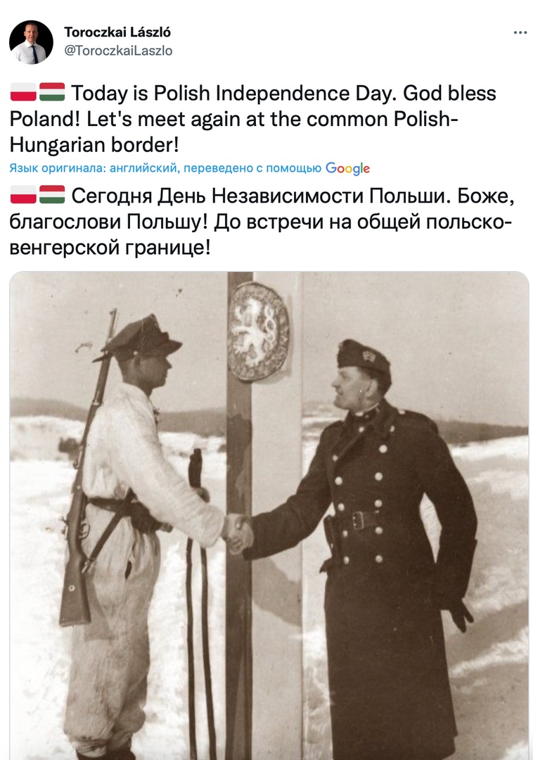 Baylee писал(а): Крайний правый депутат венгерского парламента Ласло Торочкай пожелал Польше по случаю Дня независимости снова иметь общую границу с Венгрией. В МИД Украины уже плюнул бессильной злобой т.е. считают это высказывание неприемлемым. Об этом сообщает РБК-Украина со ссылкой на Facebook спикера министрства иностранных дел Олега Николенко. "Призыв венгерского депутата Ласло Тороцкой к пересмотру государственных границ неприемлем. Призываем правительство Венгрии осудить такие безответственные высказывания, которые подвешивают двусторонние отношения и не отвечают духу добрососедства", - написал Николенко  Вот он, пост. С картиночкой. Пикча: фото, сделанное 20 марта 1939 г. на Ужокском перевале в Карпатах. Это когда Венгрия и Польша установили свою границу по итогам Мюнхенского сговора, уничтожившего Чехословакию и поделившего Западную Украину между Польшей и Венгрией. Вас уже поделили, несёстры.