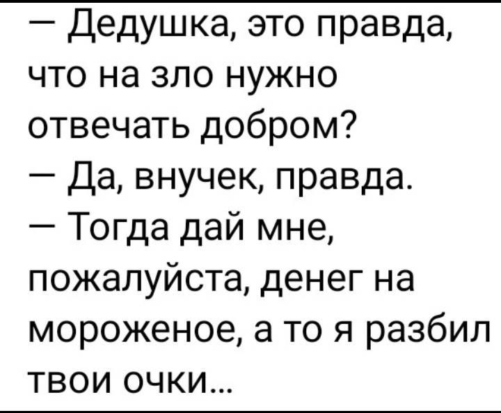 ВОСПИТАНИЕ ЗА СУТКИ ...Вспоминаю, как бабушка наша оставила нас с братом на даче. Оставила с дедом. Надо ей было уехать по делам. Нам по 8 лет было. Улеглись спать, болтаем, бесимся. Дед говорит: - Спите. Завтра подниму рано. Завтрак в девять. Нам по барабану. Заснули за полночь. Дед будит в 8.30: - Вставайте. Завтрак в девять. - Ага, деда... И спать дальше. Встаём в 11. Сарай с продуктами заперт. Ключи у деда в кармане. Бабуля-то нам по пять раз завтрак подогревала. - Деда, а завтрак? - Завтрак в девять. Помыкались, думаем, ну и ладно. - Деда, мы на речку. - Идите. Обед в час. Ушли. Приходим в половине третьего. Сарай на замке. - Деда? - Ужин в семь. После купания в речке есть охота. К тому же, ещё и не завтракали. За сараем был открыт погребок. Там стояли две трёхлитровые банки со сливочным маслом. Так вот. Два восьмилетних пацана ели это масло пальцами из банок. Семь часов. Мы уже сидим за столом. Дед накладывает в миски гречневую кашу. Я начинаю есть. Братец кашу отодвигает: - Деда, я такую не ем. Мне бабушка рассыпчатую делает. Дед, молча, забирает миску: - Завтрак в девять. - Не, деда, не убирай. Я съем. На следующий день мы с одной побудки сидели за столом в девять. Вот такое воспитание. За сутки. Без криков, нотаций и рукоприкладства.