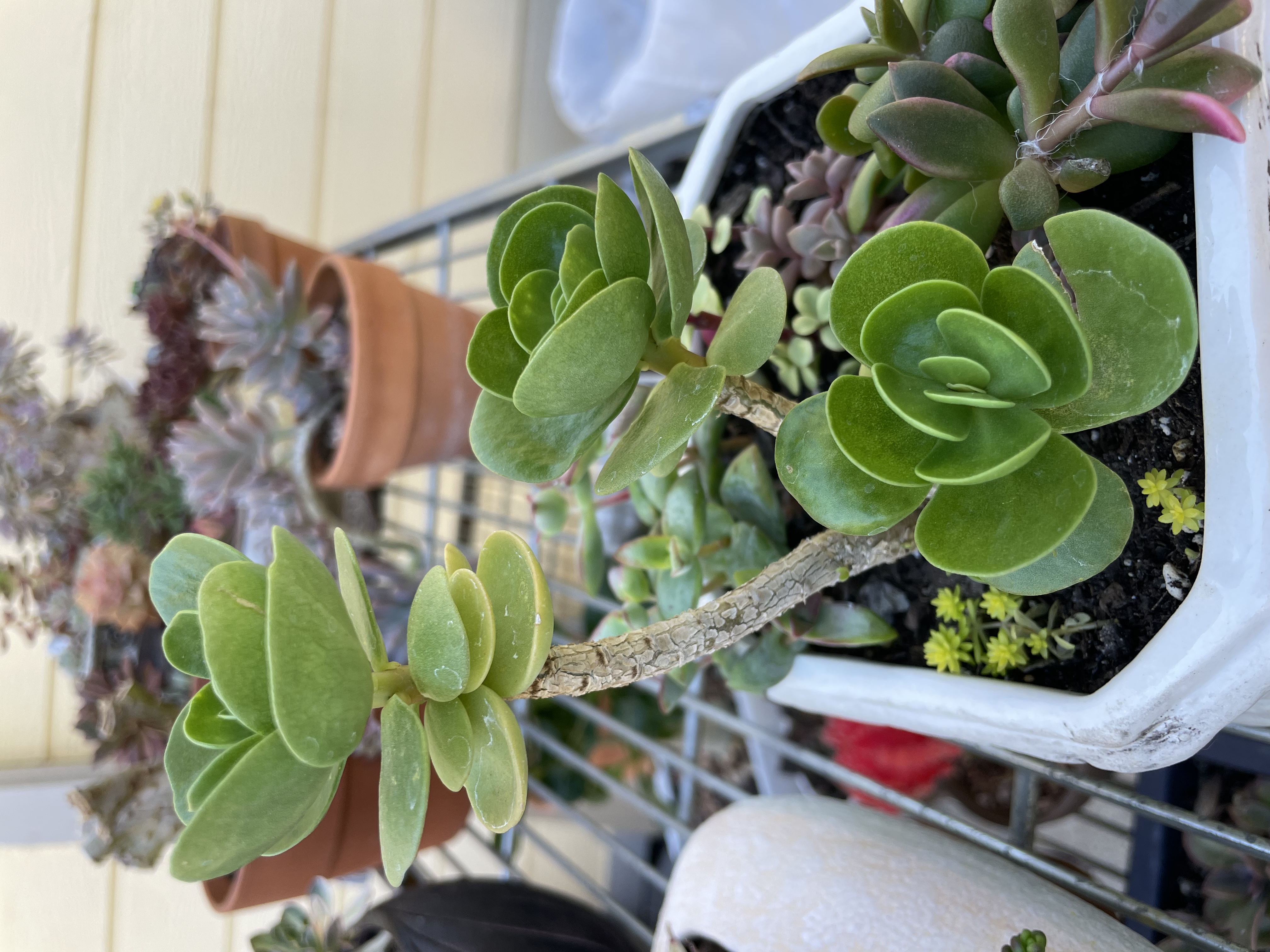 Бейли,ну где твои эониумы? Вот мои. Но пока ничего впечатляющего. А ведь они вырастают огого какие красавцы! Ну… может,у меня тоже получится  Названия не знаю, подарок. Пока растёт медленно,с прошлого года почти и не подрос. Киви,маленькая веточка. Киви,тоже был такой веточкой,но за зиму вырос. На фото он кажется меньше, чем на самом деле. Название есть,но надо рыться. Большой лопух,двойной,но невысокий пока тоже. Вот вчерашний, прям не смогла мимо пройти А это вот я не знаю,кто. Может,тоже какой элениум,но символики толстоваты и мясисты. Так,я,наверное,подписи перепутала. Ну, надеюсь,поймёшь)))