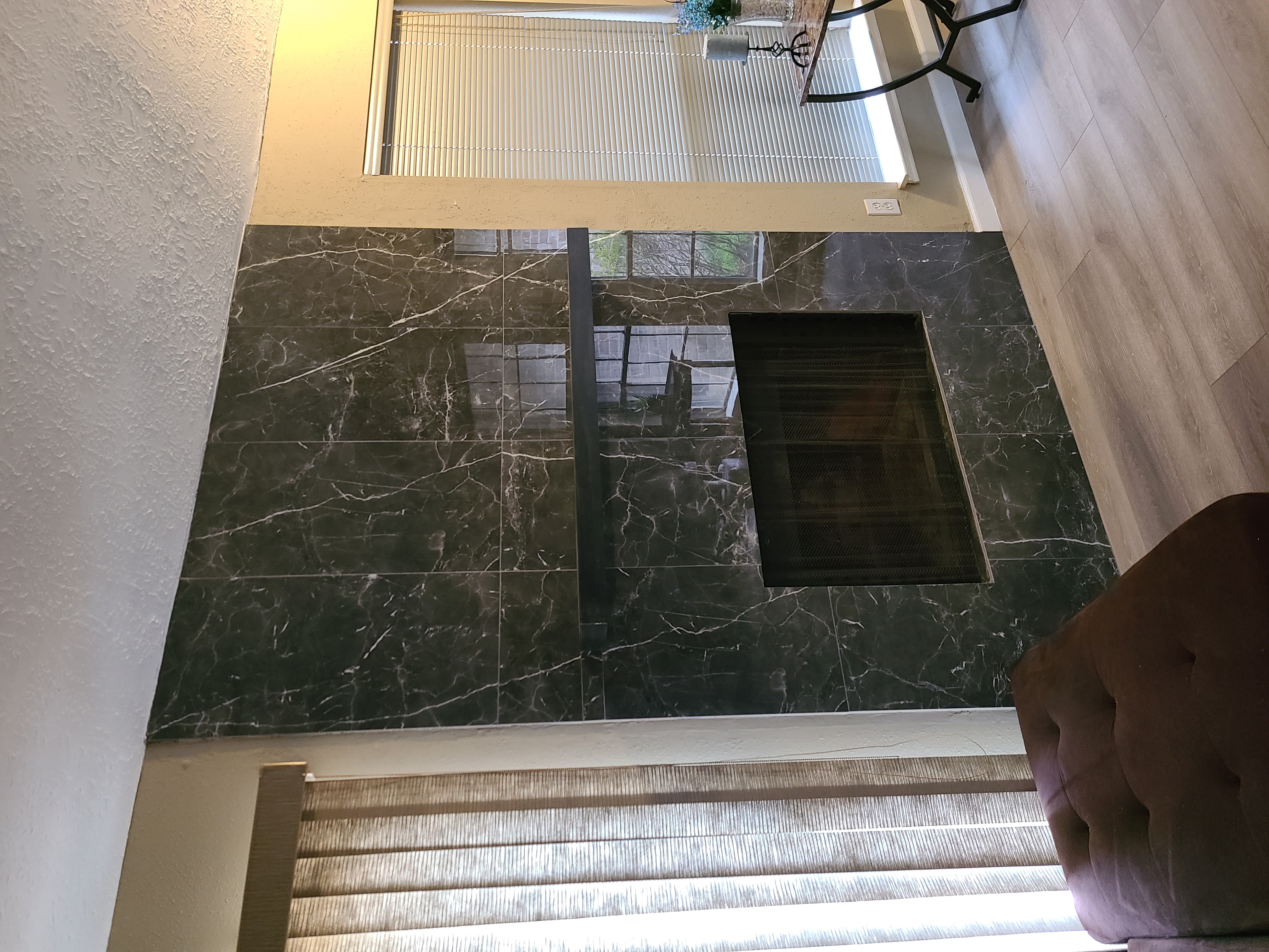 камин получился очень здорово... вам надо окна только дооформить чтобы создать разные текстуры, слоями. Можете погулить дизайн окон,но вкратце надо палки для штор поднять под потолок, повесить тяжелые шторы, и сверху между палкой и окном роман блайндс (можно фальшивые). Мелочь, но это работает очень классно. Будет 3 слоя, если жалюзи считать. Панели (обязательно блэкаут берите если надумаете менять) и так чтобы закрыли кусок стены между окном и мрамором и роман блайндс цветом можете поиграть в разные варианты. Текстиль сразу уюта добавит и будет классно с глянцевой поверхностью. И ковер слишком маленький для вашего мягкого уголка. Если такой размер нравится, то надо чтото вроде шкуры коровы, это очень модно сейчас, многие дизайнеры используют. А большие ковры по правилам берут чтобы связать группу мебели... я не занудничаю, просто камин дает потенциал сделать, это фокус, вокруг него уже надо плясать. перечитала, вроде бред получился а не совет...  ... короче, вот вам картинка - я наспех прилепила шторы, чтобы понятно было...если такие шторы нравятся, они были на распродаже в ВендВ, по 19 долларов за панель. Я себе купила, потому что они очень хорошие. Вот они сейчас по 50 долларов, может будет еще какая нибуть распродажа перед Рождеством. https://www.bedbathandbeyond.com/store/product/quinn-medallion-blackout-grommet-window-curtain-panel-single/5386315