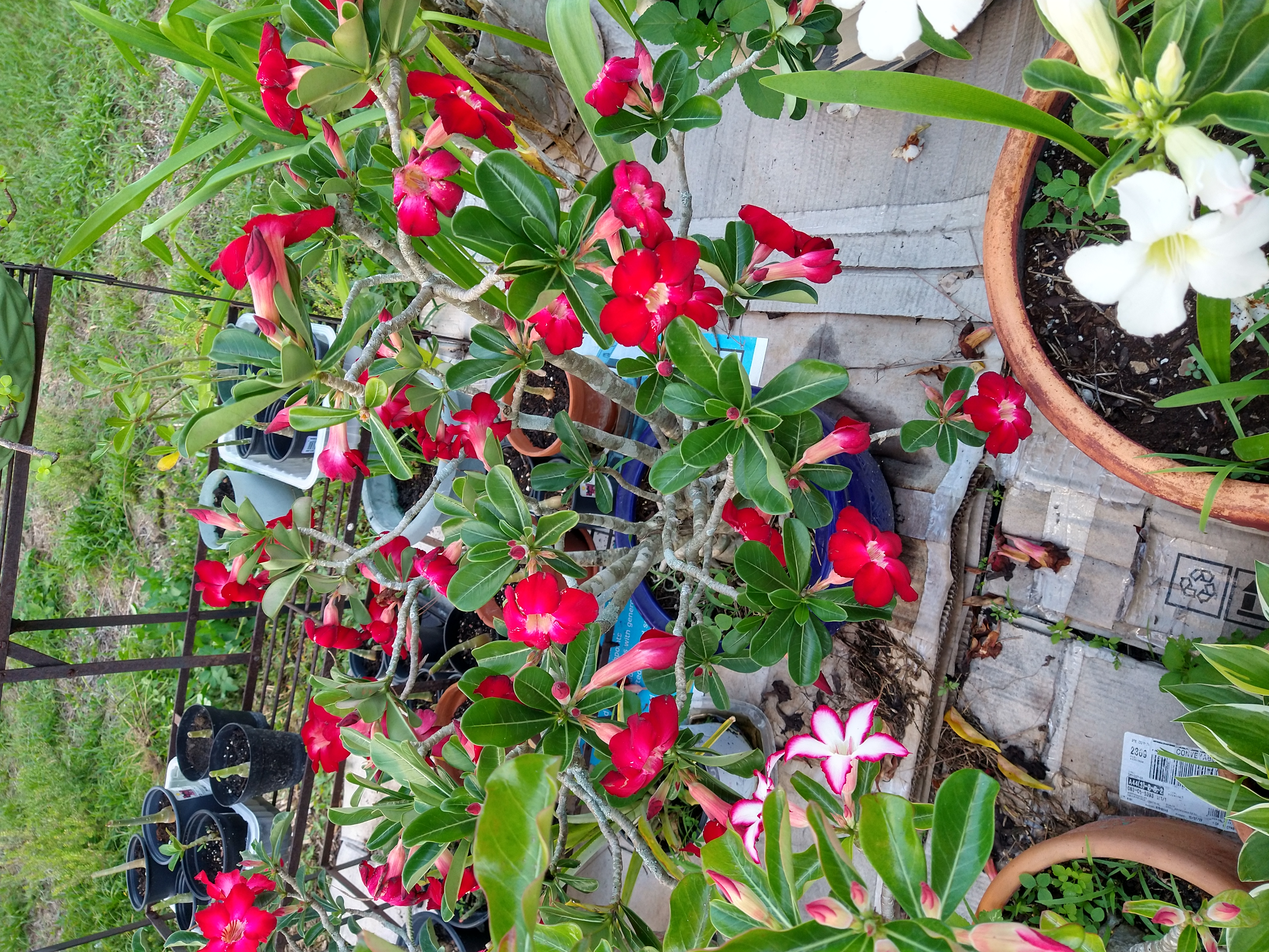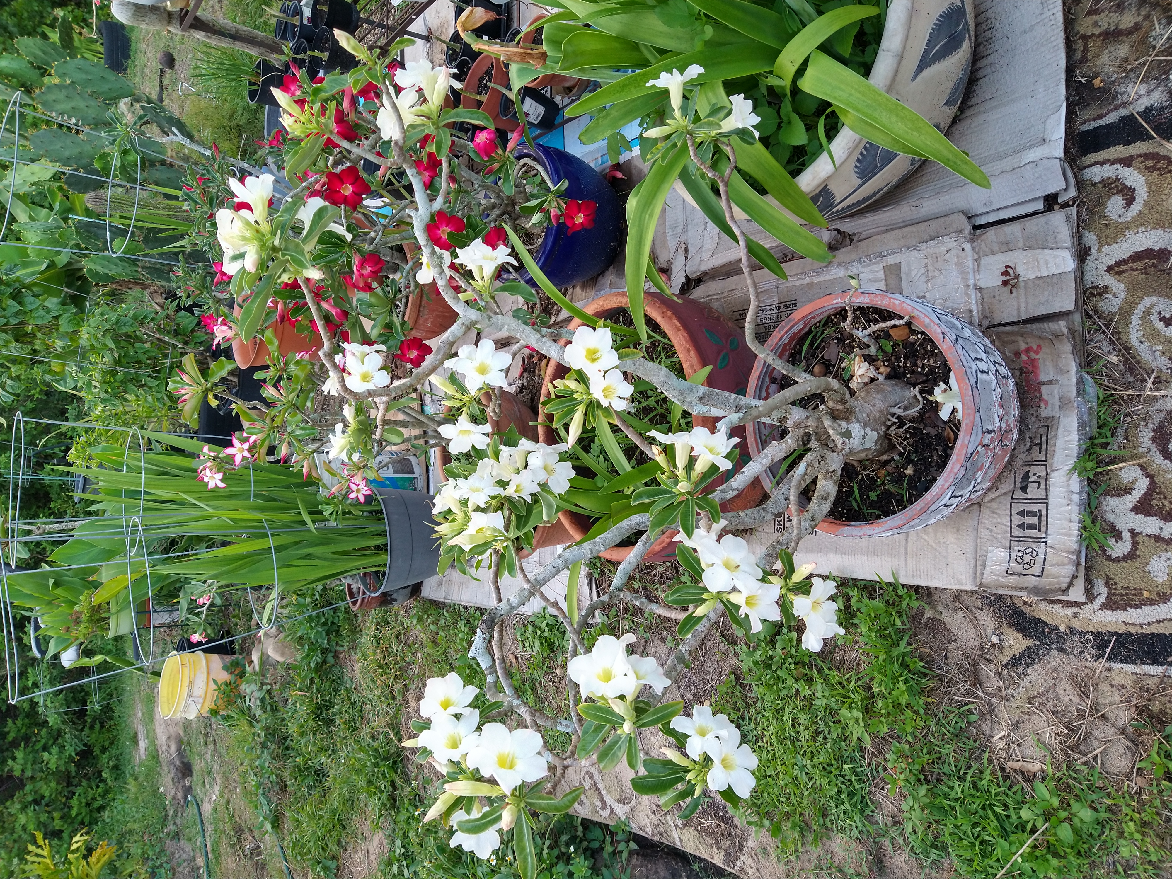 OklaXoma писал(а): mamik писал(а): Кактусы у меня тоже есть. Но мало какие выдерживают нащ климат. Мало какие цветут. Вот куст как у Оклахомы у меня тоже есть, но цвести упорно не хочет. Ну хоть что-то цветет Надо местные смотреть..ведь есть же у вас дикорастущие какты? Чолле, думаю, надо для цветения низкие зимние температуры (как и большинству кактов).вам с этим сложно. Мамик, твои Адениумы на улице круглый год? а цветут когда? Ты их не формируешь, свобода попугаям? Все из семян или где?  Что то конечно цветет. Но их мало. Чолли упорно не хочет. Как и некоторые другие. Да, я тоже думаю что это из-за отсутствия низких температут. В этом году вообще зимы не было. Так даже амариллисы не цвели, только парочка и как то совсем слабо. Кстати, твои красненькие цвели. Но тоже только парочка из всех. Адениумы на улице круглый год. Цветут март-май. Сейчас уже практически отцвели. Все у нас сезон дождей начался. Дальше будут еще цветы, но уже не так обильно как весной. Они у меня не из семян. Покупала кустиками. Но у меня уже большие кусты. Белый самый старый, он около метра высотой. Ему около 10 лет. Не помню когда точно покупала. Корни там огромные. Я их особо не формировала, они были густыми и так. Это их ураган в прошлом сентябре хорошо потрепал. Плюс безрукие газонокосильщики попортили. Вот сейчас отцвели и я их подровняю. Плюс когда они цветут, то листья совсем маленькие или их нет. Поэтому смотрятся хило. Первый опыт из семян был как раз у тех которые я тебе посылала. Вот в этом году тоже семена надеюсь созреют. Вот куст, который у тебя, в прошлом году. Сама видишь какой он густой, сколько веток было.