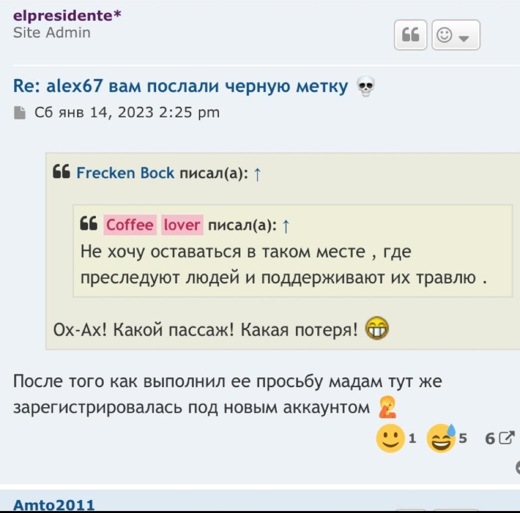 Tatmilka писал(а): Insomnia писал(а): Этот форум чахнет и довольно скоро зачахнет совсем. Я не ухожу с него ровно потому, что хочу лично понаблюдать куда засунут языки наши дамочки-патриотки когда Украина выиграет эту войну и когда сдохнет их любимый Путин. Если забанят раньше - ок. А вариант наблюдать молча не рассматривается? Нет, не рассматривается. Я люблю троллить путриоток.
