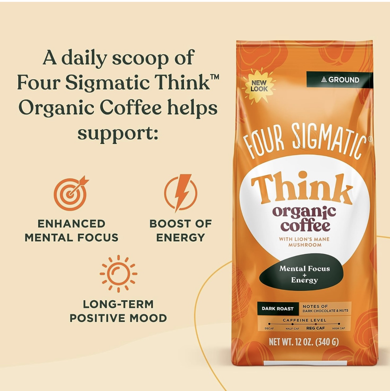 Organic Ground Mushroom Coffee by Four Sigmatic | Dark Roast, Fair Trade Gourmet Coffee with Lion's Mane, Chaga & Mushroom Powder | Immune Boosting Coffee for Focus & Immune Support | 12oz Bag https://a.co/d/76B0I2M