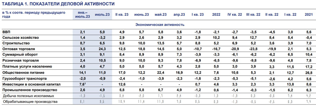 А что там с нашей экономикой?Июль-август 2023 По оценке Минэкономразвития России, в июле 2023 г. рост ВВП с исключением сезонного фактора ускорился до +0,5% м/м SA. В целом за 7 месяцев 2023 ВВП вырос на 2,1% г.г. Промышленное производство в июле выросло на +4,9% г/г после +5,8% г/г в июне (к уровню двухлетней давности +5,4% после +4,3%) Обрабатывающие производства в июле сохранили высокие темпы прироста: +9,5% г/г после +11,8% г/г в июне. Инвестиционная активность по итогам 2 квартала 2023 г. оказалась значительно выше ожиданий и прогнозных оценок. Рост по полному кругу организаций: +12,6% г/г после +0,7% г/г кварталом ранее. Грузооборот транспорта (без трубопроводного) в июле вырос на +2,5% г/г (+3,1% г/г в июне). Суммарный оборот розничной торговли, общественного питания и платных услуг населению в июле вырос на +9,1% г/г