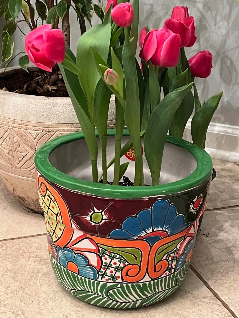 Где-то насчет горшков видела,не здесь. У Тани там, конечно, как подарки.У нас под боком открылся новый ,мой любимый Home Goods! Каких только богатств нет!  даже пододеяльники Миссони за 500 или 600$!А для огорода всяких милых прибамбaсов! Горшков всяких, и высоких, и низких, и мексиканских и испанских.Португальские все без дырок, хотя очень симпатишные. Итальянские красивущиe, но вот на них всегда снаружи выстyпает белесость. Может,я не знаю, как за ними ухаживать...  Еще по доллару сегодня купила валентиновские тюльпашки, в горшок мексиканский пока засунула.Завтра, наверное, срежу в вазу.